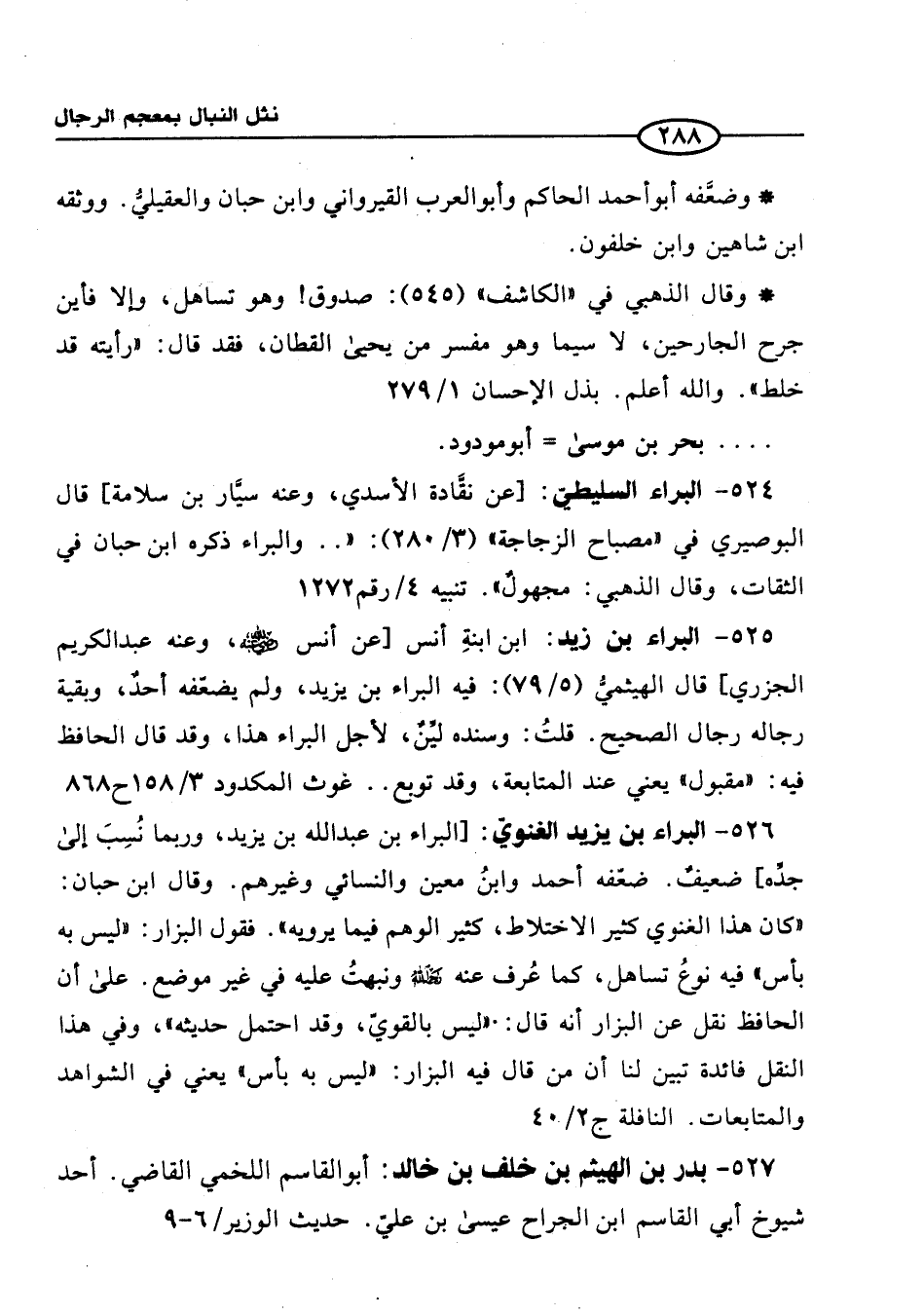 524 - البراء السليطيّ: [عن نقَّادة الأسدي، وعنه سيَّار بن سلامة] قال البوصيري في "مصباح الزجاجة" (3/ 280): ". . والبراء ذكره ابن حبان في الثقات، وقال الذهبي: مجهولٌ". تنبيه 4/ رقم 1272