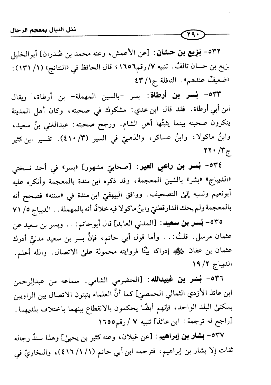 534 - بُسر بن راعي العير: [صحابيّ مشهور] "بسر" في أحد نسختي "الديباج" "بشر" بالشين المعجمة، وقد ذكره ابن مندة بالمعجمة وأنكره عليه أبو نعيم ونسبه إلى التصحيف. ووافق البيهقيّ ابن مندة في "سننه" فصحح أنه بالمعجمة ولم يحك الدارقطنيّ وابنُ ماكولا فيه خلافًا أنه بالمهملة. . الديباج 5/ 71