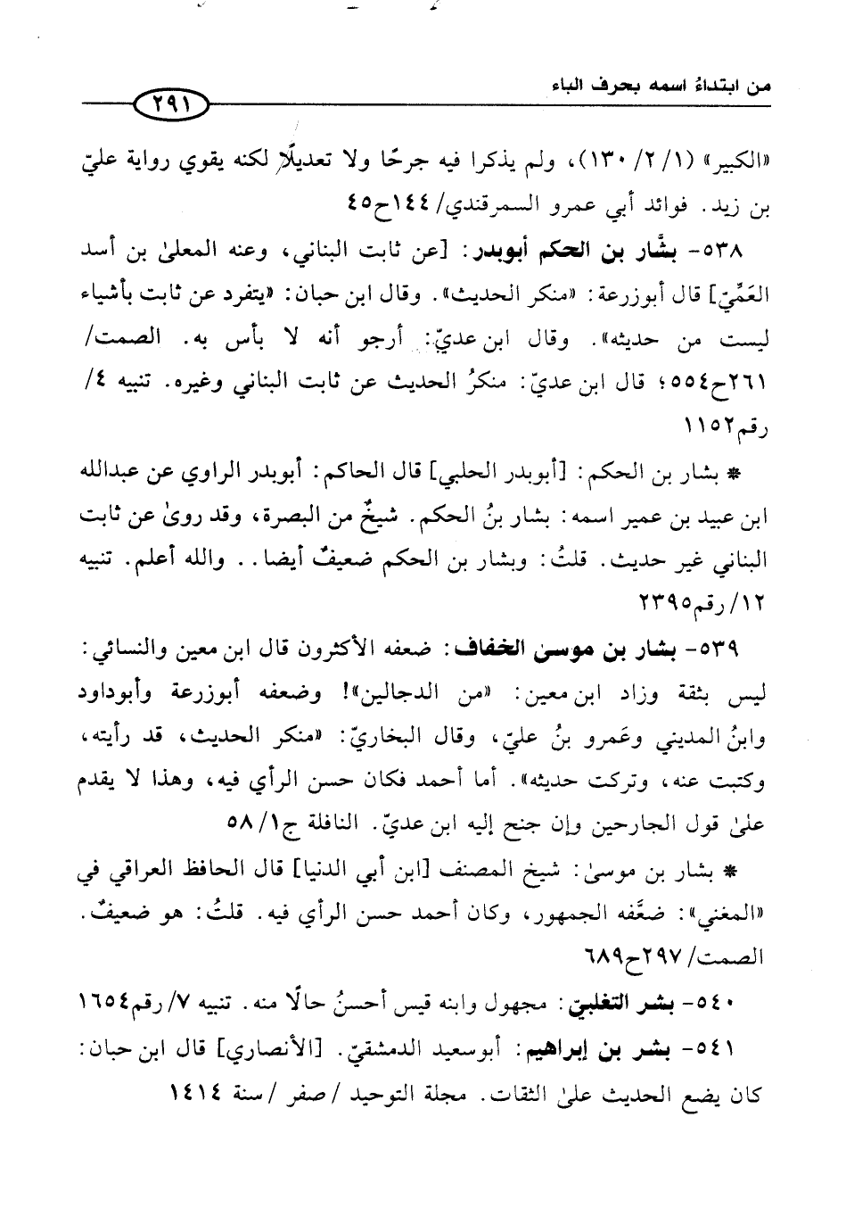 539 - بشار بن موسى الخفاف: ضعفه الأكثرون قال ابن معين والنسائي: ليس بثقة وزاد ابن معين: "من الدجالين"! وضعفه أبو زرعة وأبو داود وابنُ المديني وعَمرو بنُ عليّ، وقال البخاريّ: "منكر الحديث، قد رأيته، وكتبت عنه، وتركت حديثه". أما أحمد فكان حسن الرأي فيه، وهذا لا يقدم على قول الجارحين وإن جنح إليه ابن عديّ. النافلة ج 1/ 58