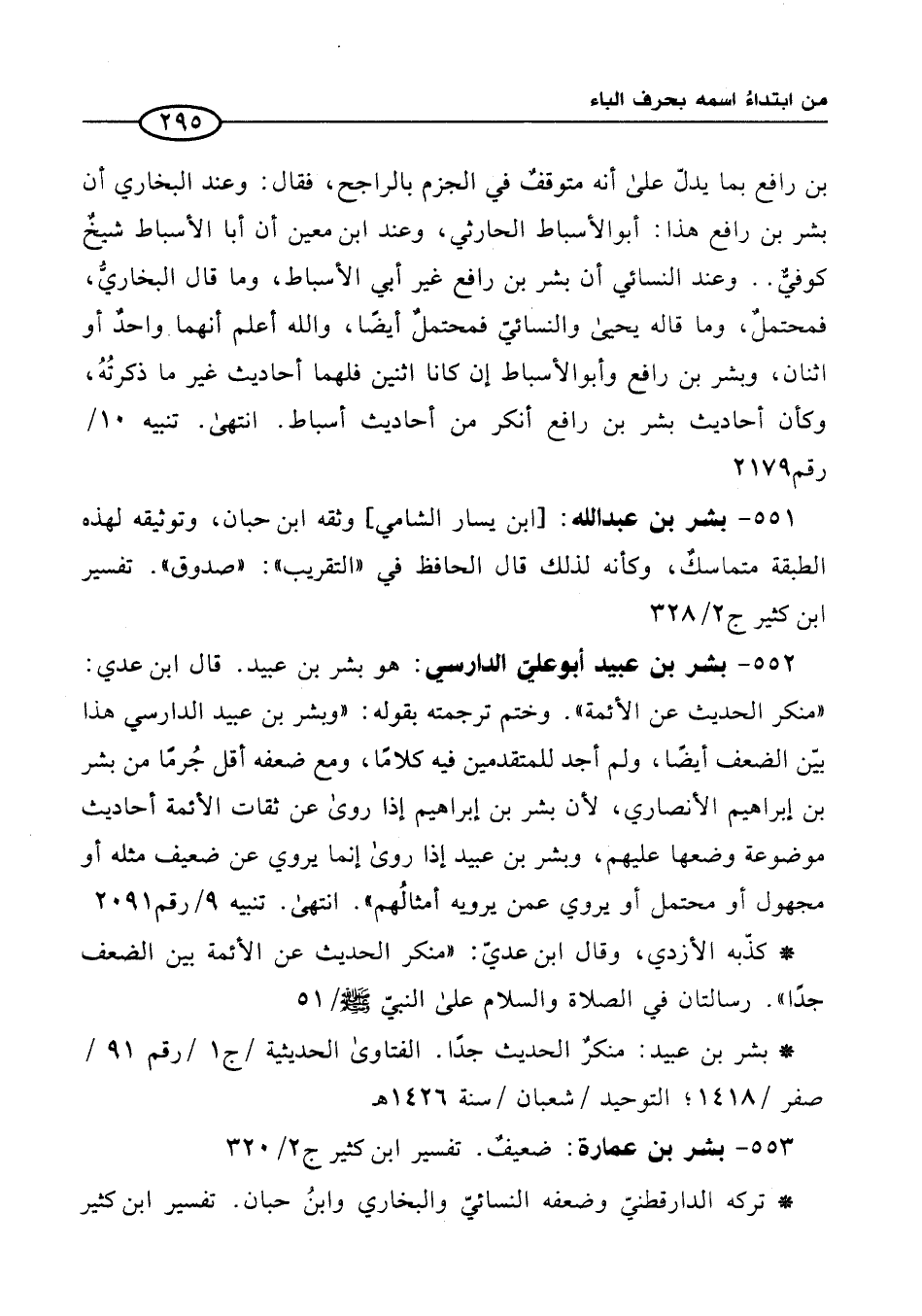 552 - بشر بن عبيد أبو عليّ الدارسي: هو بشر بن عبيد. قال ابن عدي: "منكر الحديث عن الأئمة". وختم ترجمته بقوله: "وبشر بن عبيد الدارسي هذا بيّن الضعف أيضًا، ولم أجد للمتقدمين فيه كلامًا، ومع ضعفه أقل جُرمًا من بشر بن إبراهيم الأنصاري, لأن بشر بن إبراهيم إذا روى عن ثقات الأئمة أحاديث موضوعة وضعها عليهم، وبشر بن عبيد إذا روى إنما يروي عن ضعيف مثله أو مجهول أو محتمل أو يروي عمن يرويه أمثالُهم". انتهى. تنبيه 9/ رقم 2091