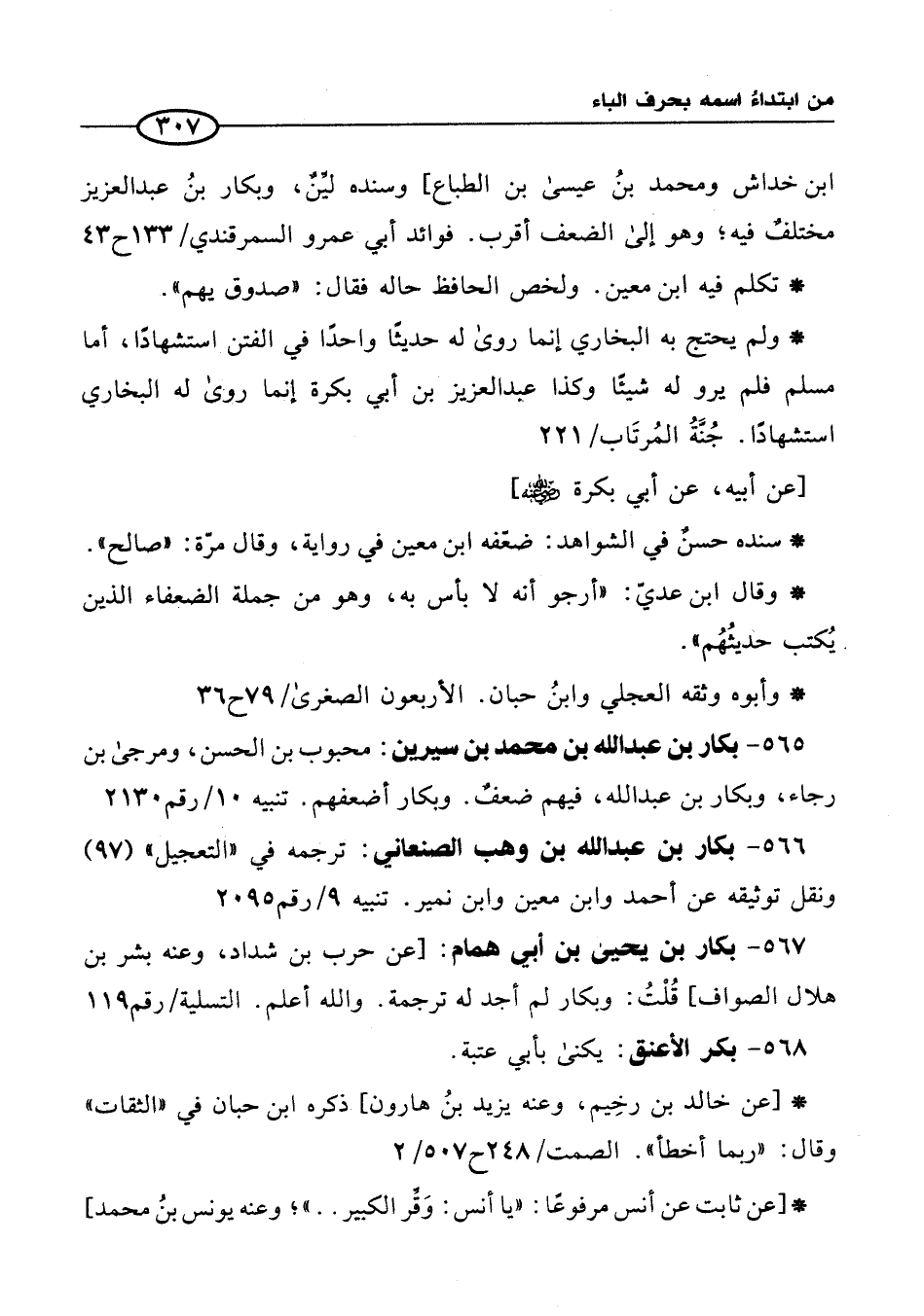 565 - بكار بن عبد الله بن محمَّد بن سيرين: محبوب بن الحسن، ومرجى بن رجاء، وبكار بن عبد الله، فيهم ضعفٌ. وبكار أضعفهم. تنبيه 10/ رقم2130