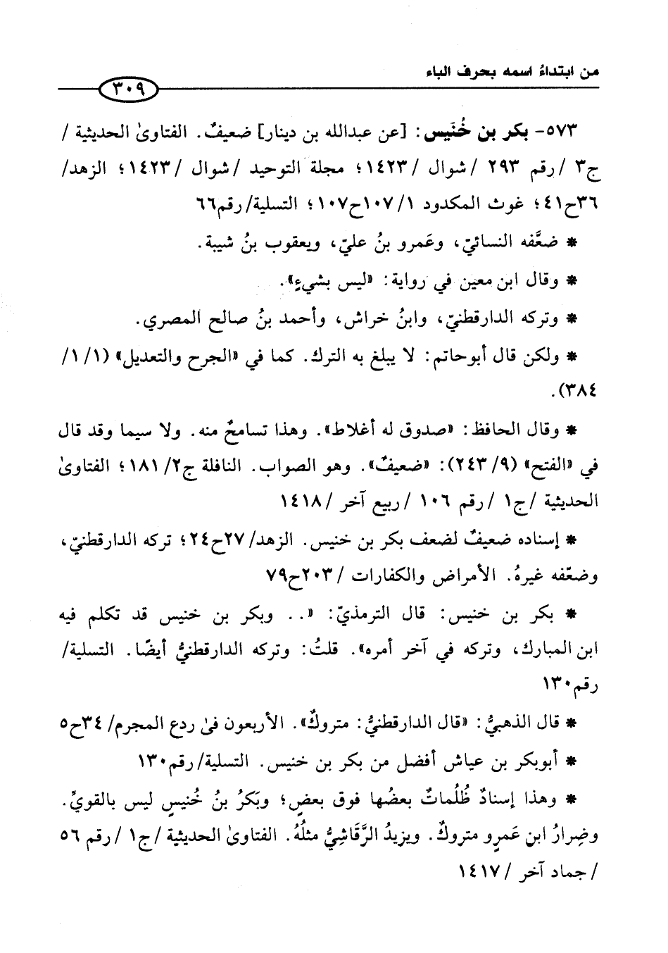 573 - بكر بن خُنَيس: [عن عبد الله بن دينار] ضعيفٌ. الفتاوى الحديثية/ ج3/ رقم 293/ شوال / 1423؛ مجلة التوحيد /شوال / 1423؛ الزهد/ 36ح41؛ غوث المكدود 1/ 107ح107؛ التسلية/ رقم 66