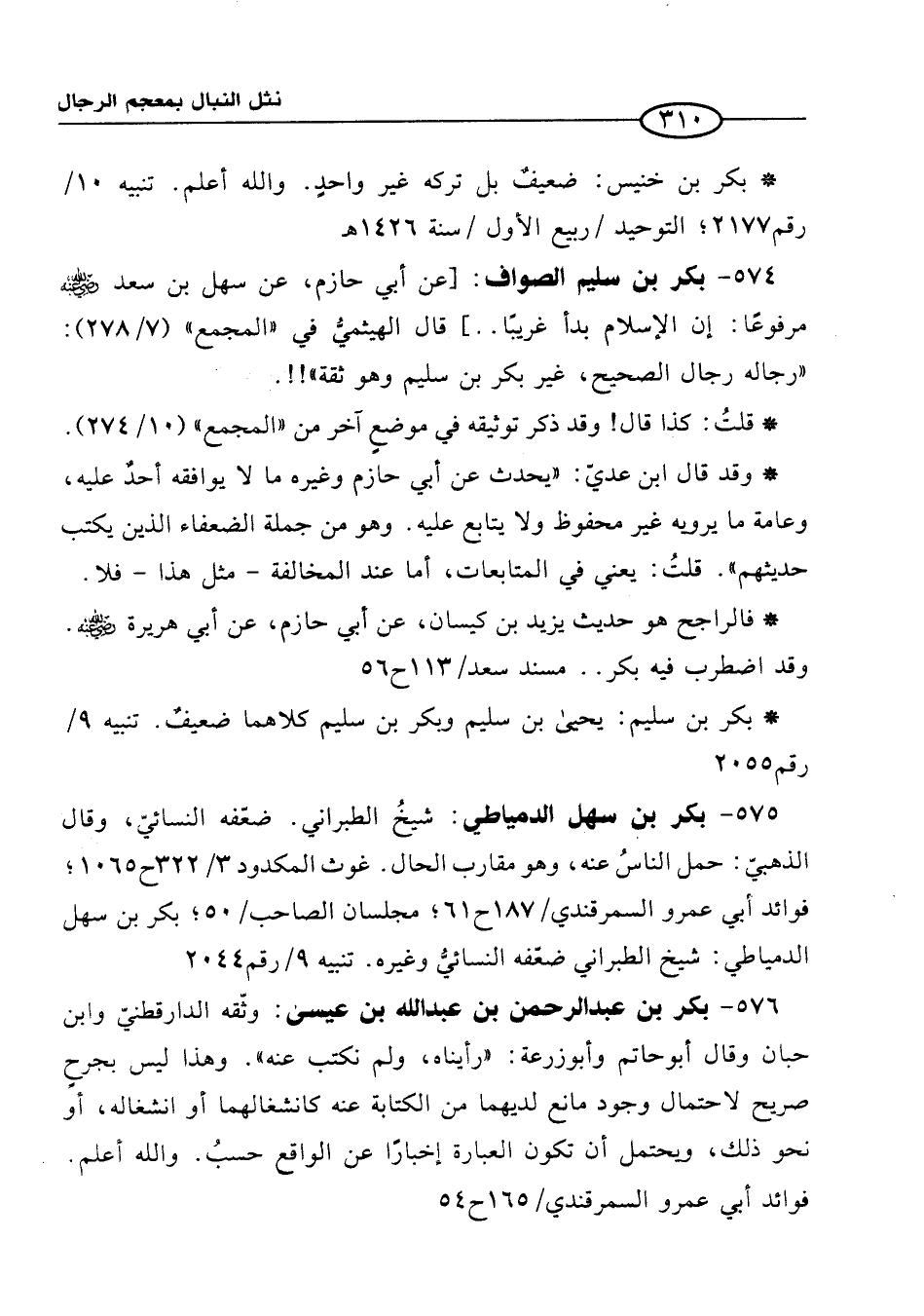 574 - بكر بن سليم الصواف: [عن أبي حازم، عن سهل بن سعد -رَضِيَ الله عَنْهُ- مرفوعًا: إن الإِسلام بدأ غريبًا. .] قال الهيثميُّ في "المجمع" (7/ 278): "رجاله رجال الصحيح، غير بكر بن سليم وهو ثقة"!!.