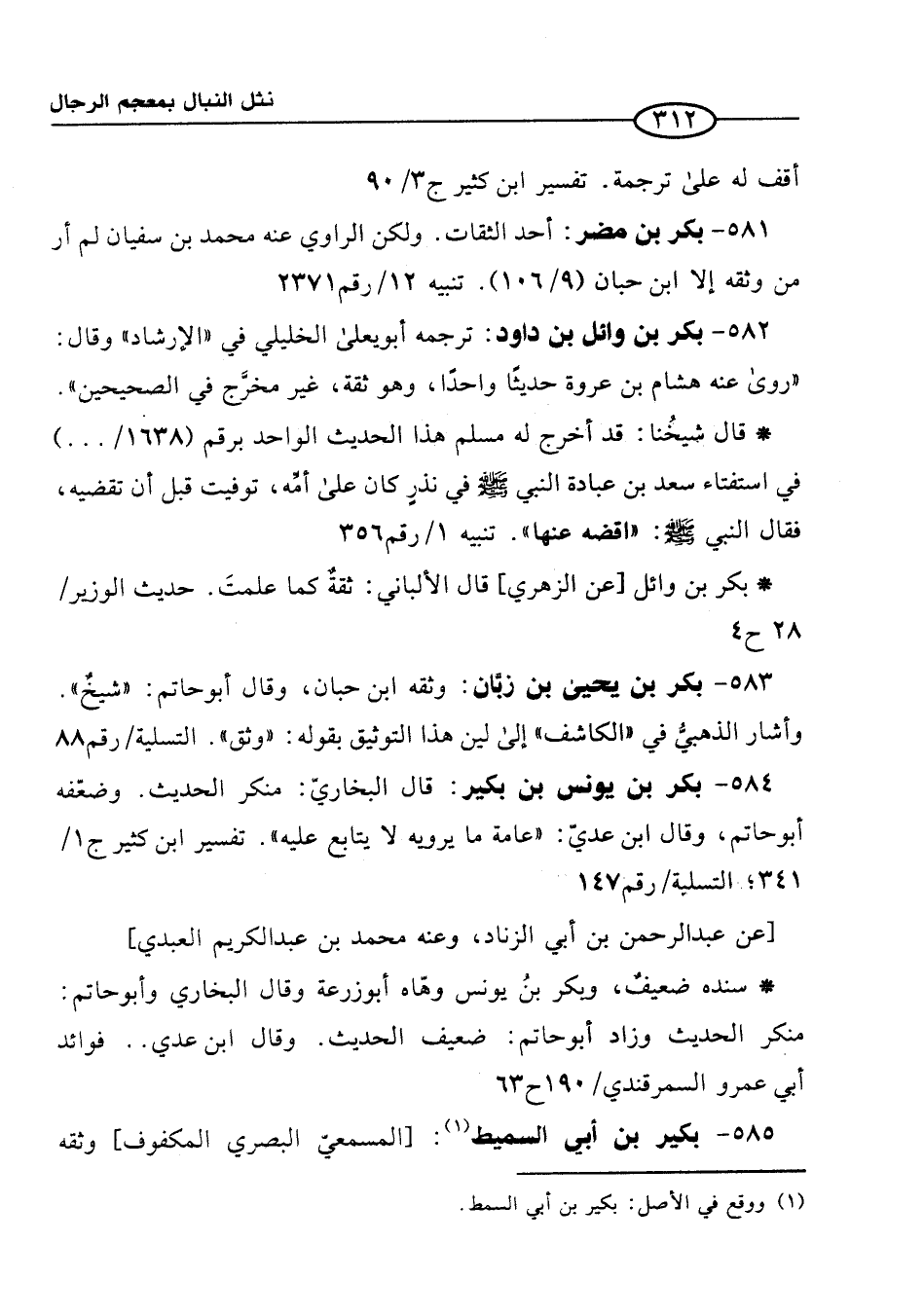 583 - بكر بن يحيى بن زبَّان: وثقه ابن حبان، وقال أبو حاتم: "شيخٌ". وأشار الذهبيُّ في "الكاشف" إلى لين هذا التوثيق بقوله: "وثق". التسلية/ رقم88