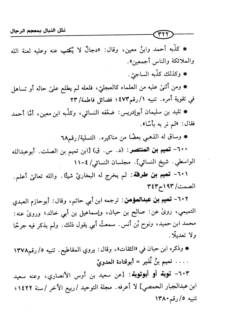 602 - تميم بن عبد المؤمن: ترجمه ابن أبي حاتم، وقال: أبو حازم العبدي التميمي، روى عن: صالح بن حيان، وإسماعيل بن أبي خالد؛ وروى عنه: محمَّد ابن حميد، ونوح بُن أنس. سمعتُ أبي يقول ذلك. ولم يذكر فيه جرحًا ولا تعديلًا.