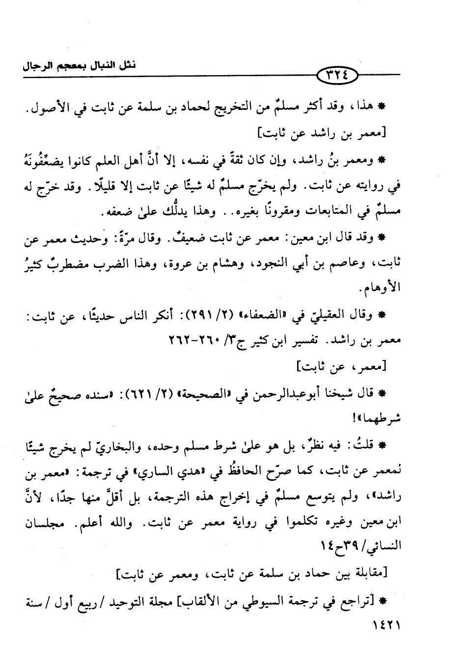 * ومعمر بنُ راشد، وإن كان ثقةً في نفسه، إلا أنَّ أهل العلم كانوا يضعِّفُونَهُ في روايته عن ثابت. ولم يخرّج مسلمٌ له شيئًا عن ثابت إلا قليلًا. وقد خرّج له مسلمٌ في المتابعات ومقرونًا بغيره. . وهذا يدلُّك على ضعفه.
