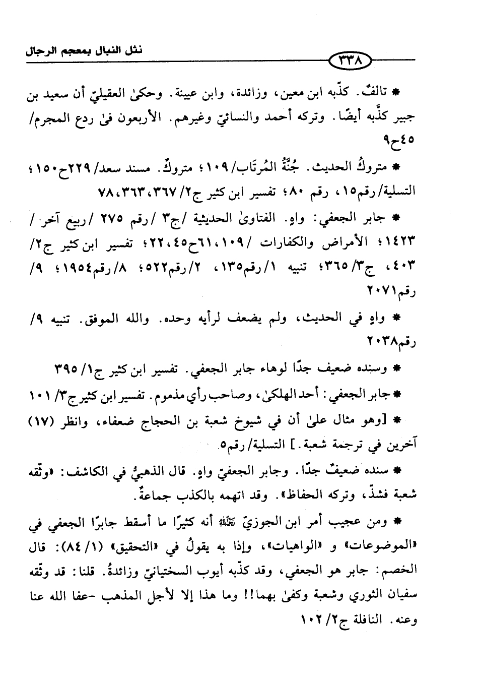 * ومن عجيب أمر ابن الجوزيّ رحمه الله أنه كثيرًا ما أسقط جابرًا الجعفي في "الموضوعات" و"الواهيات"، وإذا به يقولُ في "التحقيق" (1/ 84): قال الخصم: جابر هو الجعفي، وقد كذِّبه أيوب السختيانيّ وزائدةُ. قلنا: قد وثّقه سفيان الثوري وشعبة وكفى بهما!! وما هذا إلا لأجل المذهب- عفا الله عنا وعنه. النافلة ج2/ 102