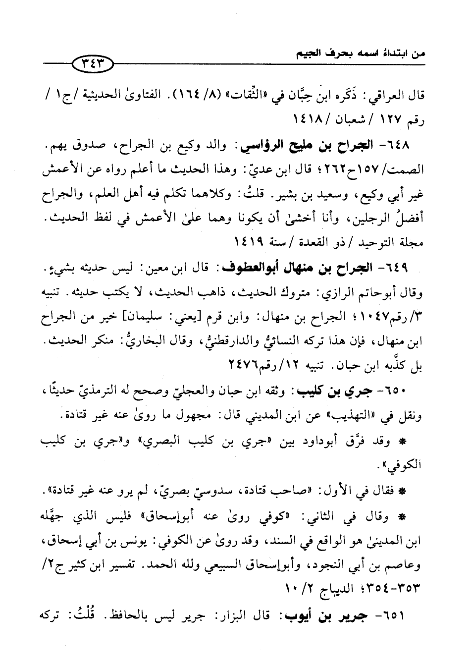 648 - الجراح بن مليح الرؤاسي: والد وكيع بن الجراح، صدوق يهم. الصمت/ 157ح 262؛ قال ابن عديّ: وهذا الحديث ما أعلم رواه عن الأعمش غير أبي وكيع، وسعيد بن بشير. قلتُ: وكلاهما تكلم فيه أهل العلم، والجراح أفضلُ الرجلين، وأنا أخشى أن يكونا وهما علي الأعمش في لفظ الحديث. مجلة التوحيد /ذو القعدة/ سنة 1419