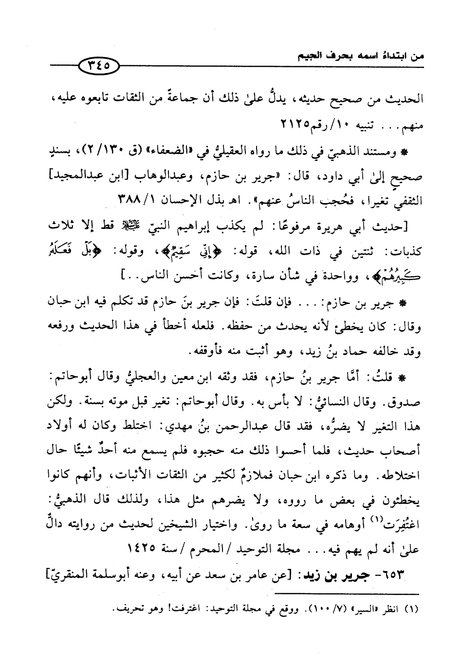 * قلتُ: أمَّا جرير بنُ حازم، فقد وثقه ابن معين والعجليُّ وقال أبو حاتم: صدوق. وقال النسائيُّ: لا بأس به. وقال أبو حاتم: تغير قبل موته بسنة. ولكن هذا التغير لا يضرُّه، فقد قال عبد الرحمن بنُ مهدي: اختلط وكان له أولاد أصحاب حديث، فلما أحسوا ذلك منه حجبوه فلم يسمع منه أحدٌ شيئًا حال اختلاطه. وما ذكره ابن حبان فملازمٌ لكثير من الثقات الأثبات، وأنهم كانوا يخطئون في بعض ما رووه، ولا يضرهم مثل هذا, ولذلك قال الذهبيُّ: اغتُفِرَت (1) أوهامه في سعة ما روى. واختيار الشيخين لحديث من روايته دالٌّ على أنه لم يهم فيه. . . مجلة التوحيد /المحرم/ سنة 1425