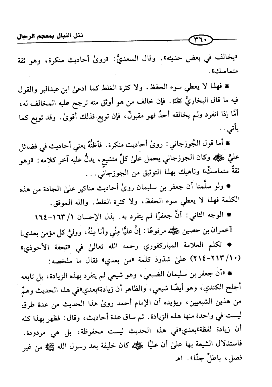 * أما قول الجُوزجاني: روى أحاديث منكرة. فأظنُّهُ يعني أحاديث في فضائل عليٍّ رضي الله عنه وكان الجوزجاني يحمل على كلِّ متشيعٍ، يدلُّ عليه آخر كلامه: "وهو ثقةٌ متماسكٌ" وناهيك بهذا التوثيق من الجوزجاني. . .