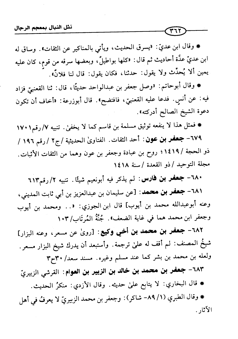 681 - جعفر بن محمَّد: [عن سليمان بن عبد العزيز بن أبي ثابت المديني، وعنه أبو عبد الله محمَّد بن أيوب] قال ابن الجوزي: ". . ومحمد بن أيوب وجعفر ابن محمَّد هما في غاية الضعف". جُنَّةُ المُرتَاب/103