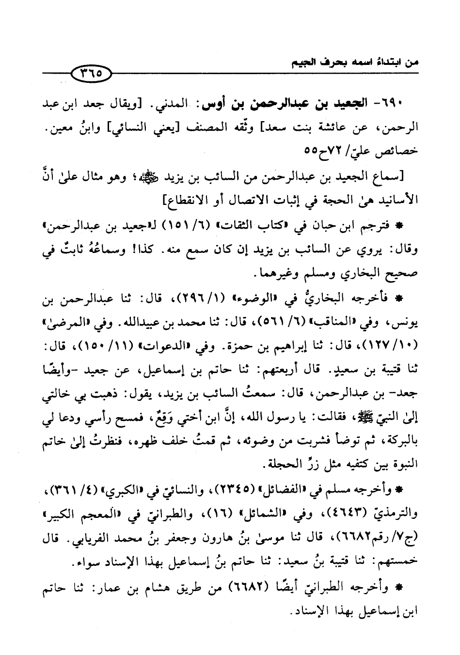 690 - الجعيد بن عبد الرحمن بن أوس: المدني. [ويقال جعد ابن عبد الرحمن، عن عائشة بنت سعد] وثّقه المصنف [يعني النسائي] وابن معين. خصائص عليّ/ 72 ح 55