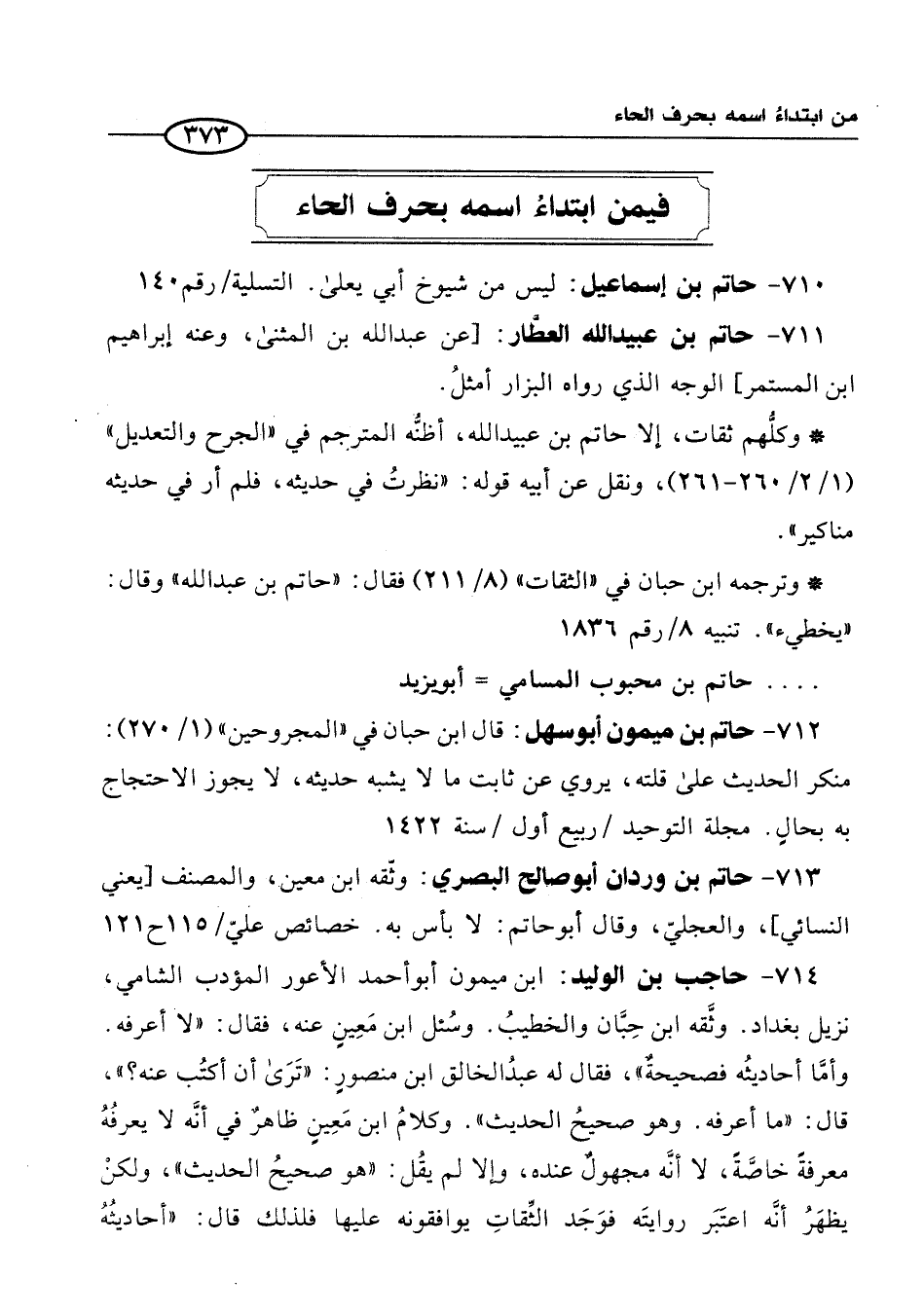 712 - حاتم بن ميمون أبو سهل: قال ابن حبان في "المجروحين" (1/ 270): منكر الحديث على قلته، يروي عن ثابت ما لا يشبه حديثه، لا يجوز الاحتجاج به بحالٍ. مجلة التوحيد / ربيع أول/ سنة 1422