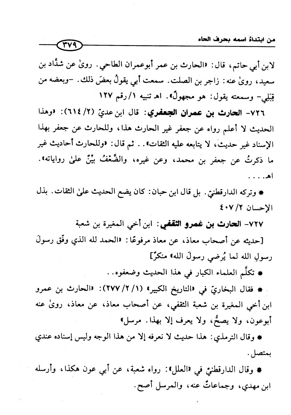 * فقال البخاريّ في "التاريخ الكبير" (1/ 2 / 277): "الحارث بن عمرو ابن أخي المغيرة بن شعبة الثقفي، عن أصحاب معاذ، عن معاذ، روى عنه أبو عون، ولا يصحُّ، ولا يعرف إلا بهذا. مرسل"