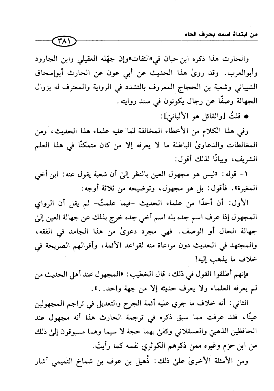 الثاني: أنه خلاف ما جرى عليه أئمة الجرح والتعديل في تراجم المجهولين عينًا، فقد عرفت مما سبق ذكره في ترجمة الحارث هذا أنه مجهول عند الحافظين الذهبيّ والعسقلاني وكفى بهما حجة لا سيما وهما مسبوقون إلى ذلك من ابن حزم وغيره ممن ذكرهم الكوثري نفسه كما رأيتَ.