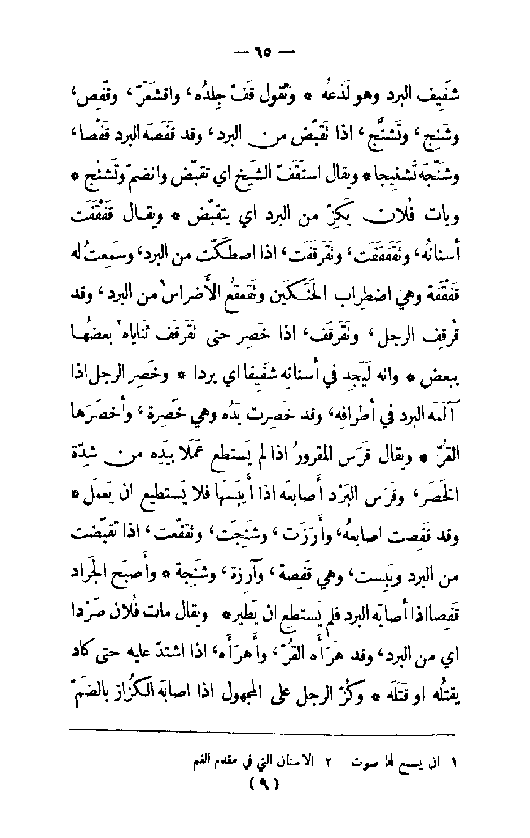 وَتَقُولُ: قَفَّ جِلْده، وَاقْشَعَرَّ، وَقَفِصَ، وَشَنِجَ، وَتَشَنَّجَ، إِذَا تَقَبَّضَ مِنْ الْبَرْدِ، وَقَدْ قَفَصه الْبَرْد قَفْصًا، وَشَنَّجَهُ تَشْنِيجاً.