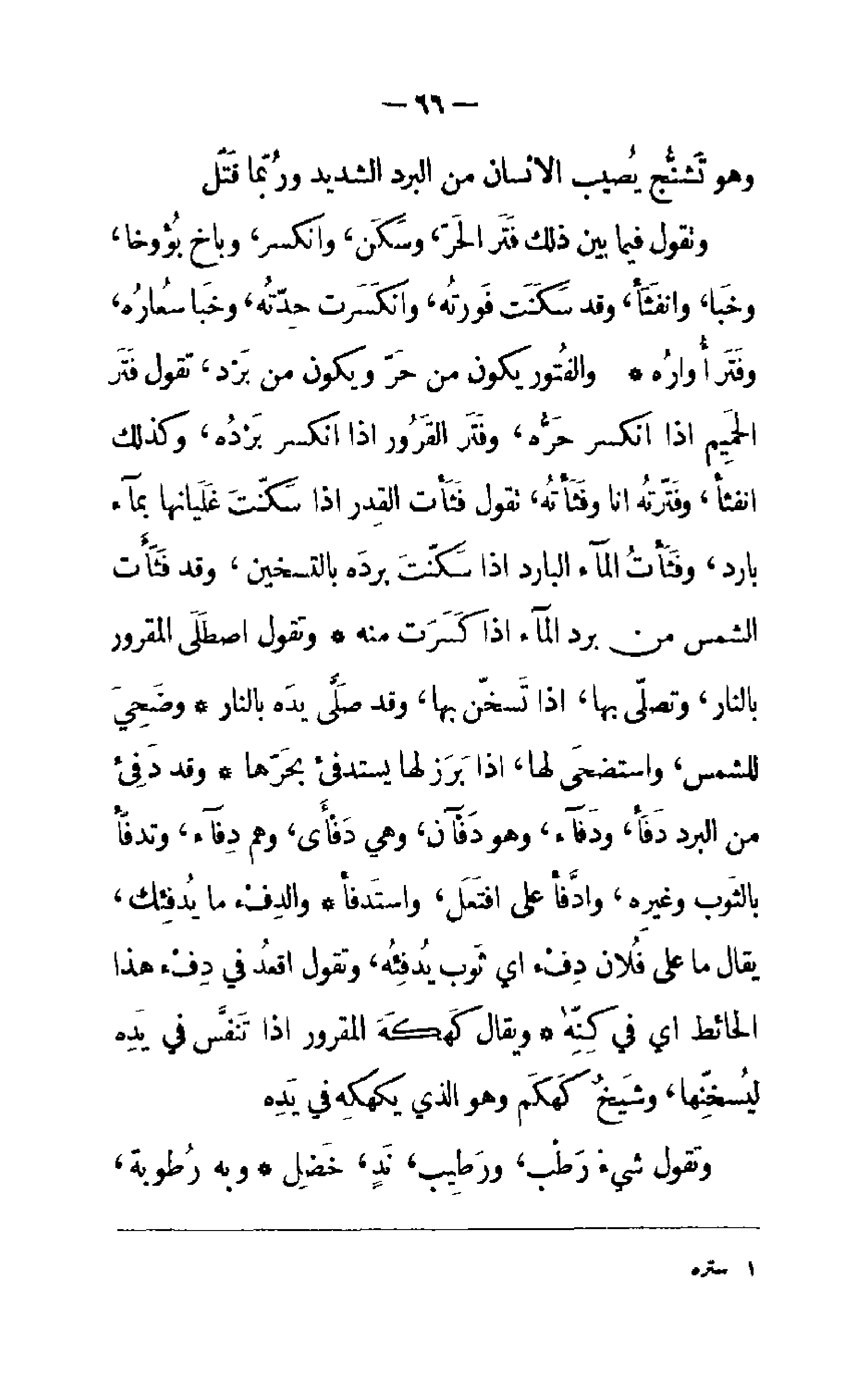 وَتَقُولُ فِيمَا بَيْنُ ذَلِكَ فَتَرَ الْحَرُّ، وَسَكَنَ، وَانْكَسَرَ، وَبَاخَ بُؤُوخاً، وَخَبَا، وَانْفَثَأ َ، وَقَدْ سَكَنَتْ فَوْرَتُهُ وَانْكَسَرَتْ حِدَّته، وَخَبَا سُعَاره، وَفَتَرَ أُوَاره.