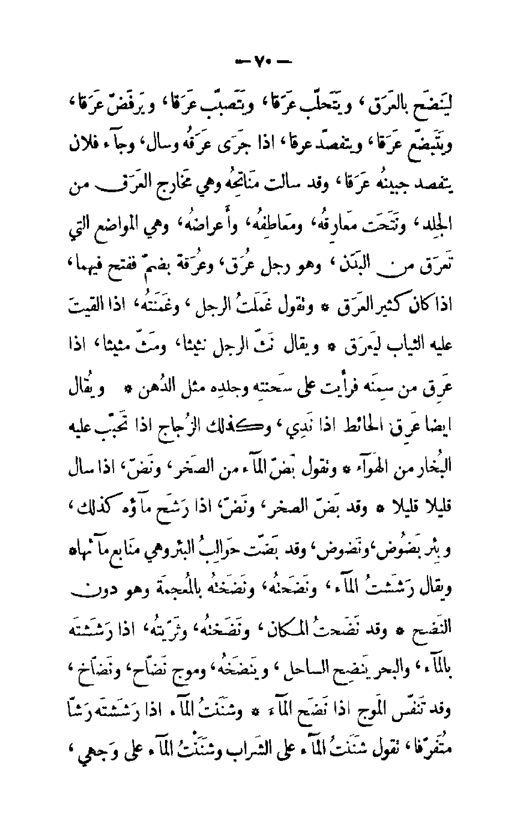 لَيَنْضَح بِالْعَرَقِ، وَيَتَحَلَّب عَرَقاً، وَيَتَصَبَّب عَرَقاً، وَيَرْفَضّ عَرَقاً، وَيَتَبَضَّع عَرَقاً، وَيَتَفَصَّد عَرَقاً، إِذَا جَرَى عَرَقه وَسَالَ، وَجَاءَ فُلان يَتَفَصَّدُ جَبِينُهُ عَرَقاً، وَقَدْ سَالَتْ مَنَاتِحه وَهِيَ مَخَارِجُ الْعَرَق مِنْ الْجِلْدِ، وَنَتَحَتْ مَعَارِقه، وَمَعَاطِفه، وَأَعْرَاضه، وَهِيَ الْمَوَاضِعُ الَّتِي تَعْرَقُ مِنْ الْبَدَنِ، وَهُوَ رَجُل عُرَق، وَعَرَقَة بِضَمٍّ فَفَتْحٍ فِيهِمَا، إِذَا كَانَ كَثِيرَ الْعَرَقِ.