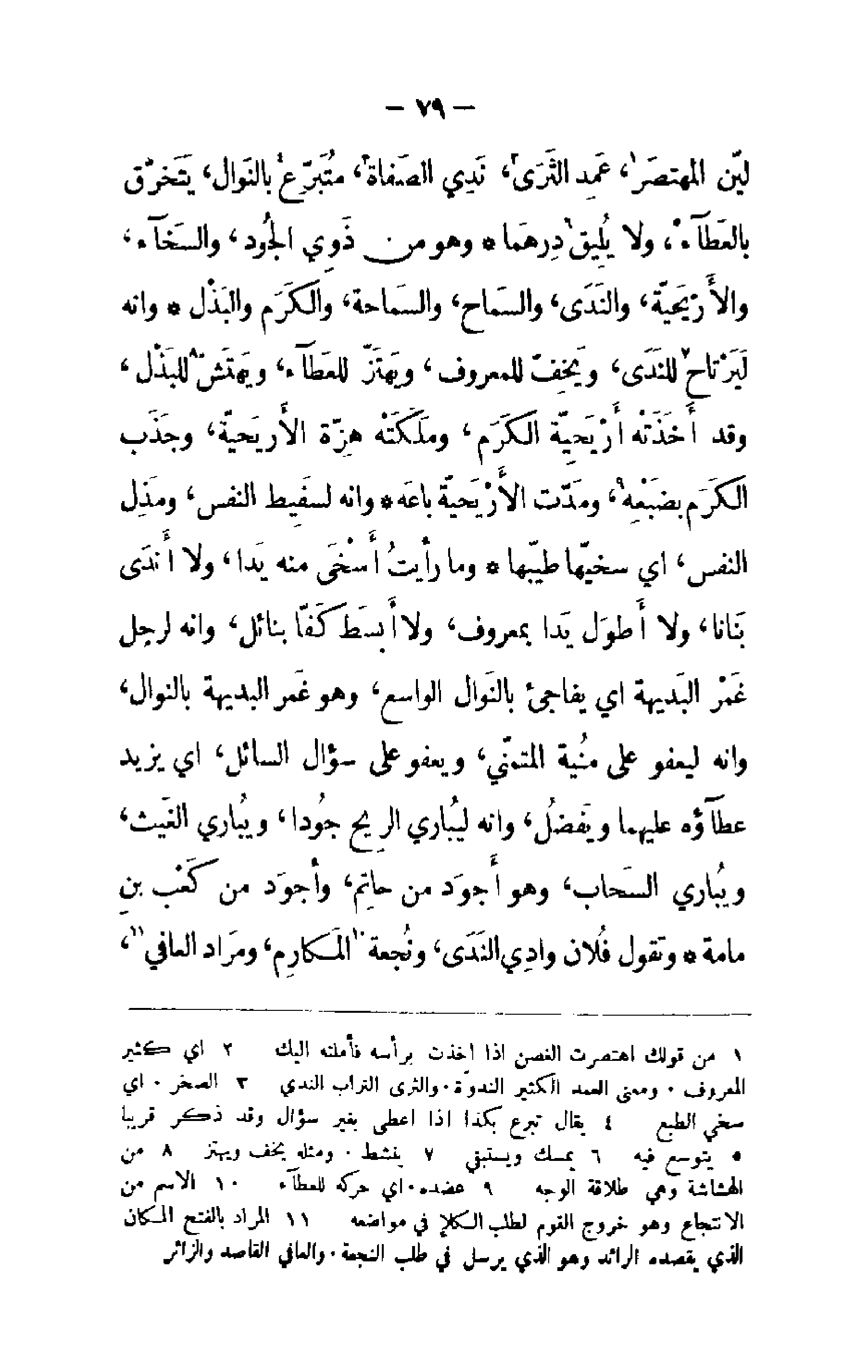 وَإِنَّهُ لَسَفِيط النَّفْس، وَمَذِلُ النَّفْسِ، أَي سَخِيُّهَا طَيِّبُهَا، وَمَا رَأَيْت أَسَخَى مِنْهُ يَداً، وَلا أَنْدَى بَنَاناً، وَلا أَطْوَلَ يَداً بِمَعْرُوف، وَلا أَبْسَطَ كَفًّاً بِنَائِل، وَإِنَّهُ لَرَجُلٌ غَمْر الْبَدِيهَة أَيْ يُفَاجِئُ بِالنَّوَالِ الْوَاسِعِ، وَهُوَ غَمْر الْبَدِيهَة بِالنَّوَالِ، وَإِنَّهُ لَيَعْفُو عَلَى مَنِيَّةِ الْمُتَمَنِّي، وَيَعْفُو عَلَى سُؤَالِ السَّائِلِ، أَيْ يَزِيدُ عَطَاؤُهُ عَلَيْهِمَا وَيُفَضِّلُ، وَإِنَّهُ لَيُبَارِي الرِّيحَ جُوداً، وَيُبَارِي الْغَيْث، وَيُبَارِي السَّحَاب، وَهُوَ أَجْوَدُ مِنْ حَاتِم، وَأَجْوَدُ مَنْ كَعْب بْن مامة.