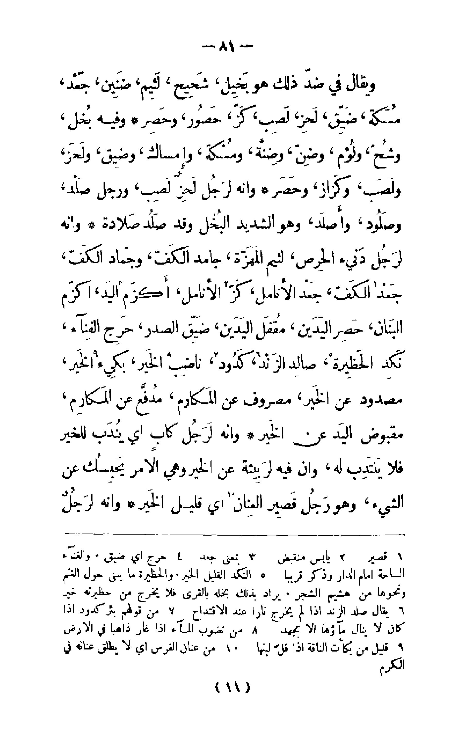 وَإِنَّهُ لَرَجُل دَنِيء الْحِرْص، لَئِيم الْمَهَزَّة، جَامِد الْكَفّ، وَجَمَاد الْكَفّ، جَعْد الْكَفّ، جَعْد الأَنَامِل، كَزّ الأَنَامِل، أَكْزَم الْيَد، أَكْزَم الْبَنَان، حَصِر الْيَدَيْنِ، مُقْفَل الْيَدَيْنِ، ضَيِّق الصَّدْرِ، حَرِج الْفِنَاء، نَكِدُ الْحَظِيرَة، صَالِد الزَّنْد، كَدُود، نَاضِب الْخَيْر، بَكِيء الْخَيْر، مَصْدُود عَنْ الْخَيْرِ، مَصْرُوف عَنْ الْمَكَارِمِ، مُدَفَّع عَنْ الْمَكَارِمِ، مَقْبُوض الْيَدِ عَنْ الْخَيْرِ.