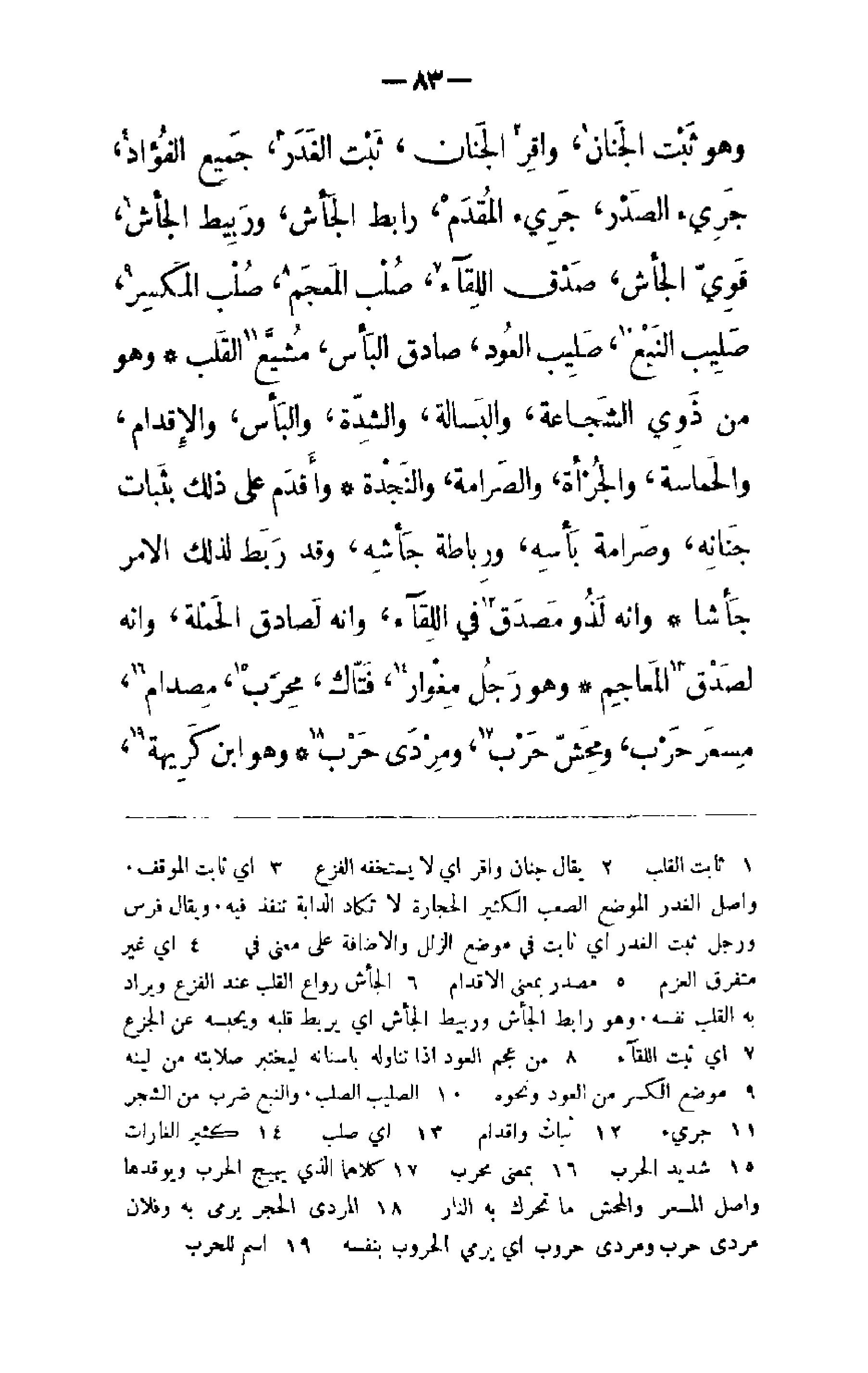 وَهُوَ ثَبْت الْجَنَان، وَاقِر الْجَنَان، ثَبْت الْغَدَر جَمِيع الْفُؤَادِ، جَرِيء الصَّدْر، جَرِيء الْمُقْدَمِ، رَابِط الْجَأْشِ، وَرَبِيط الْجَأْش، قَوِيّ الْجَأْشِ، صَدْقُ اللِّقَاء، صُلْب الْمَعْجَمِ، صُلْب الْمَكْسِر، صَلِيب النَّبْع، صَلِيب الْعُود، صَادِق الْبَأْس، مُشَيَّع الْقَلْب.