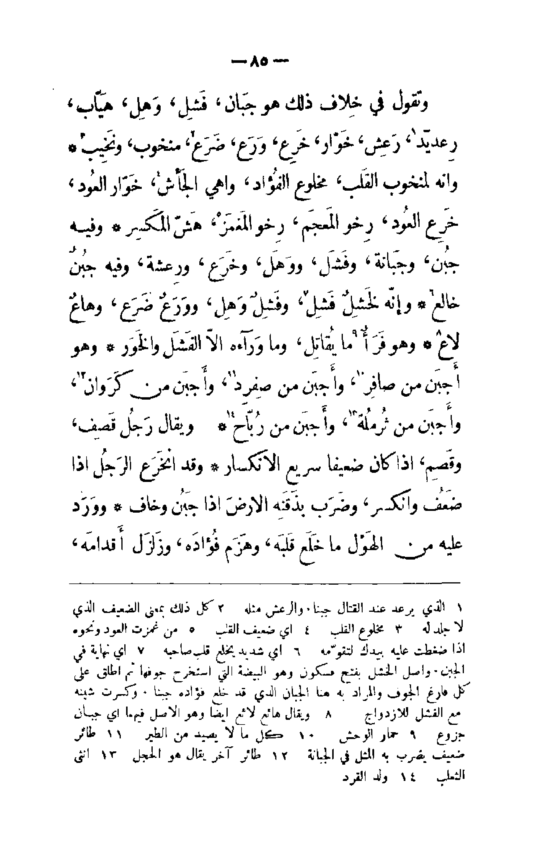 وَهُوَ فَرَأٌ مَا يُقَاتِلُ، وَمَا وراءه إِلا الْفَشَل وَالْخَوَر، وَهُوَ أَجْبَنُ مِنْ صَافِر، وَأَجْبَن مِنْ صِفْرِد، وَأَجْبَن مِنْ كَرَوَان، وَأَجْبَن مِنْ ثَرْمَلَة، وَأَجْبَن مِنْ رَبَاح، وَيُقَالُ رَجُلُ قَصِف، وَقَصِم، إِذَا كَانَ ضَعِيفاً سَرِيعَ الانْكِسَارِ.