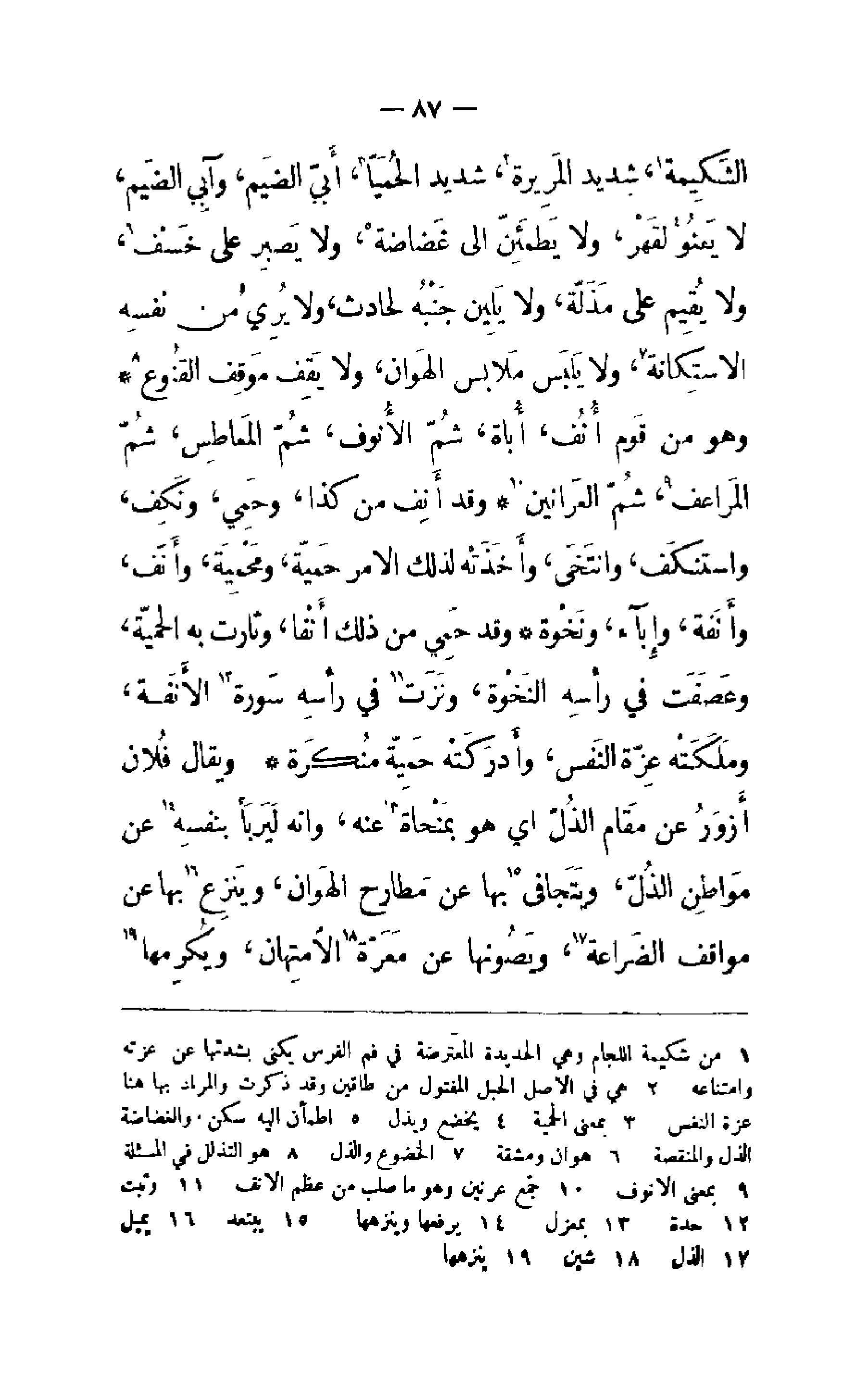 الشَّكِيمَة شَدِيد الْمَرِيرَة، شَدِيد الْحُمَيَّا، أَبِي الضَّيْمِ، وَآبِي الضَّيْم، لا يَعْنُو لِقَهْر، وَلا يَطْمَئِنُّ إِلَى غَضَاضَة، وَلا يَصْبِرُ عَلَى خَسْف، وَلا يُقِيمُ عَلَى مَذَلَّة، وَلا يَلِينُ جَنْبه لِحَادِث، وَلا يَرَى مِنْ نَفْسِهِ الاسْتِكَانَةَ، وَلا يَلْبَسُ مَلابِسَ الْهَوَان، وَلا يَقِفُ مَوْقِف الْقُنُوعِ.