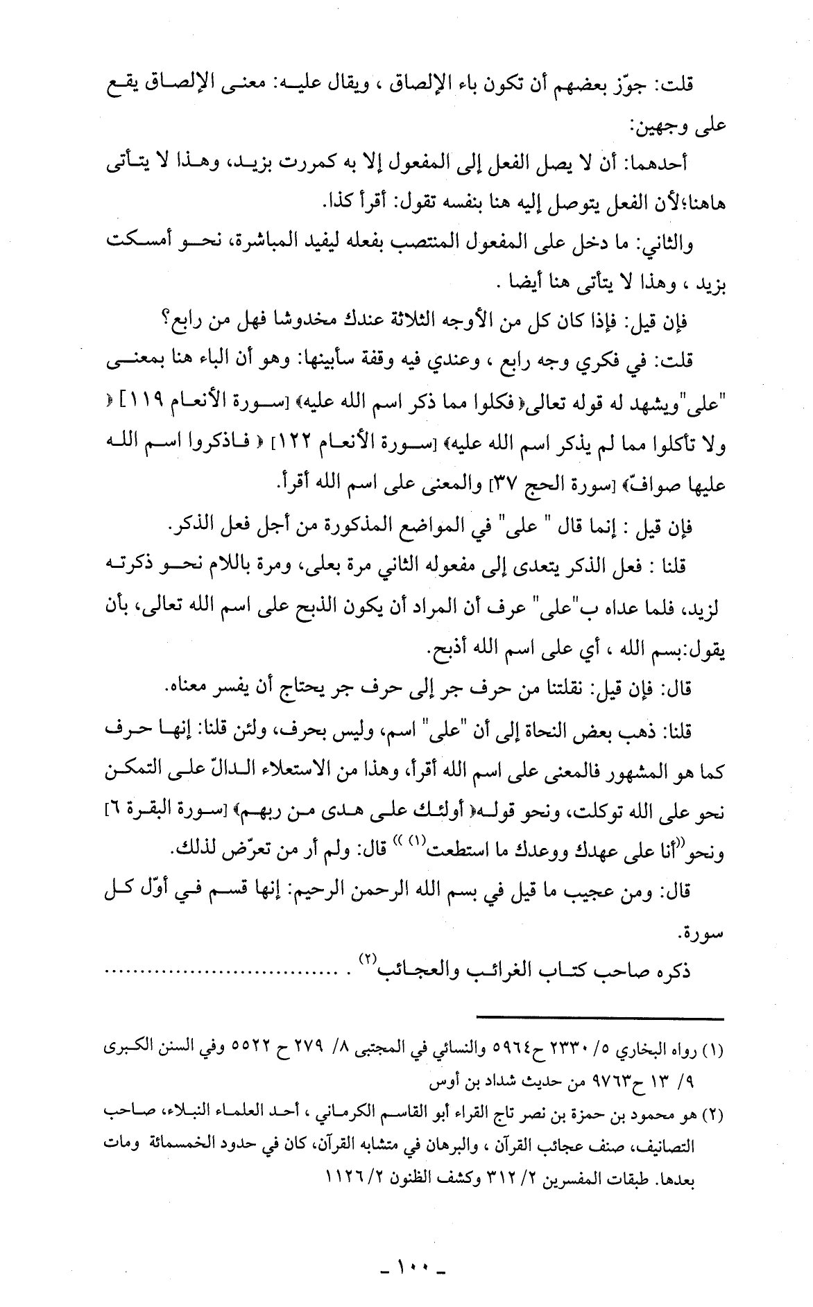 (2) هو محمود بن حمزة بن نصر تاج القراء أبو القاسم الكرماني، أحد العلماء النبلاء، صاحب التصانيف، صنف عجائب القرآن، كان في حدود الخمسمائة ومات بعدها. طبقات المفسرين 2/ 312 وكشف الظنون 2/ 1126.