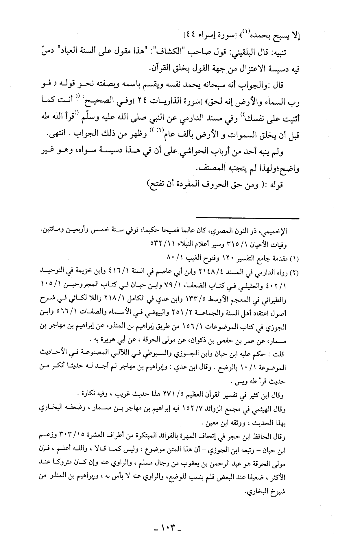 تنبيه: قال البلقيني: قول صاحب " الكشاف ". " هذا مقول على ألسنة العباد " دسّ فيه دسيسة الاعتزال من جهة القول بخلق القرآن.