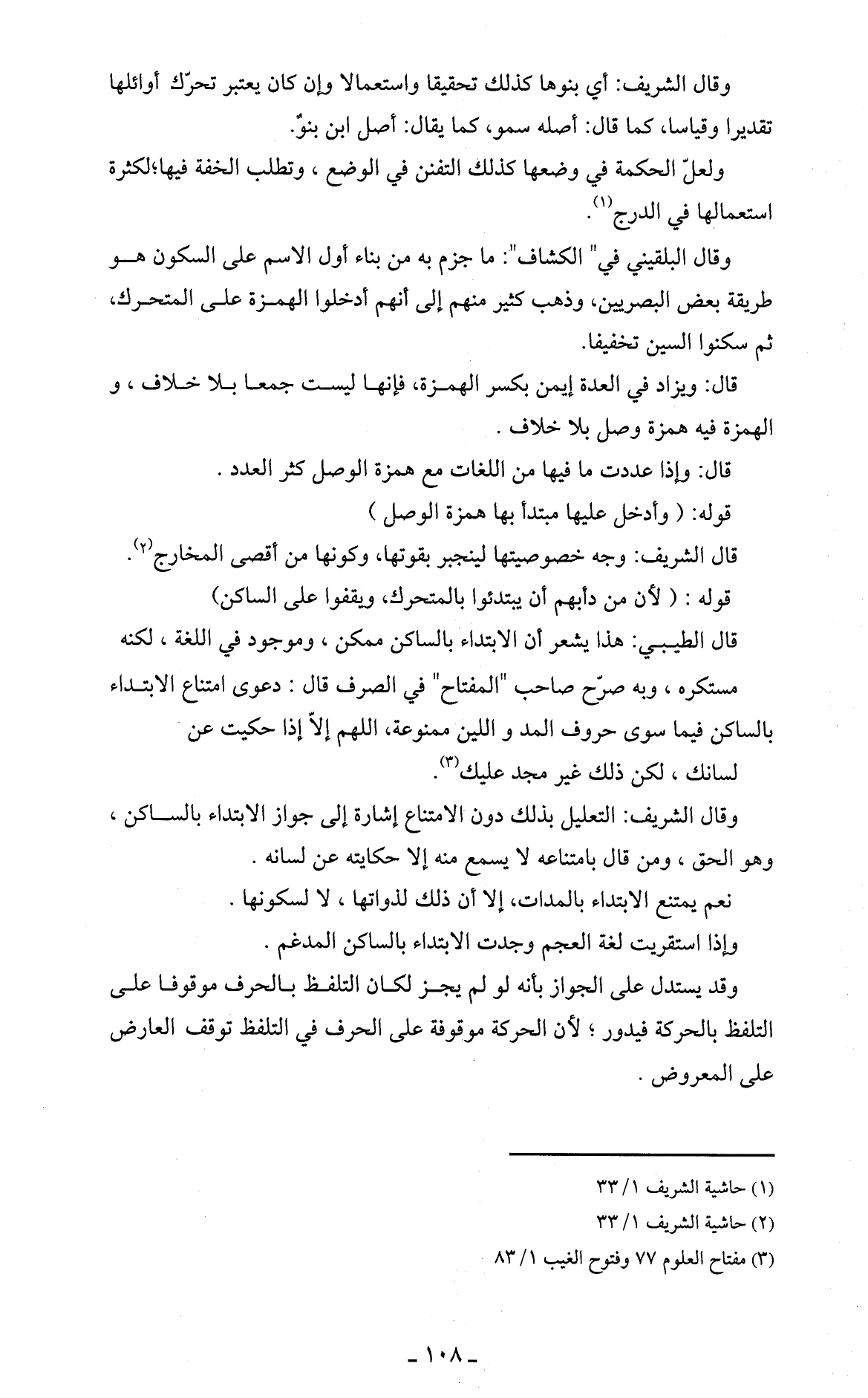 قال الطيبي: هذا يشعر أن الابتداء بالساكن ممكن، وموجود في اللغة، لكنه مستكره، وبه صرّح صاحب " المفتاح " في الصرف قال: دعوى امتناع الابتداء بالساكن فيما سوى حروف المد واللين ممنوعة، اللهم إلاّ إذا حكيت عن لسانك، لكن ذلك غير مجد عليك (3).