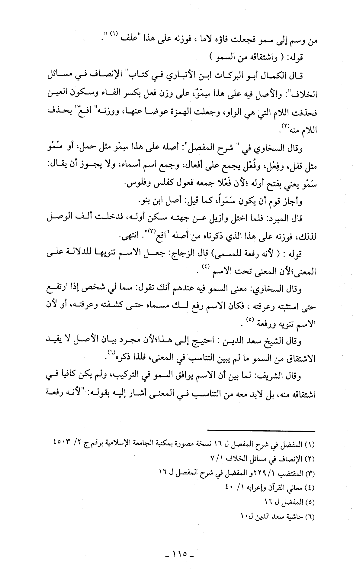 قال الكمال أبو البركات ابن الأنباري في كتاب " الإنصاف في مسائل الخلاف ": والأصل فيه على هذا سِمْوٌ، على وزن فعل بكسر الفاء وسكون العين فحذفت اللام التي هي الواو، وجعلت انهمزة عوضا عنها، ووزنه " افعٌ " بحذف اللام منه (2).