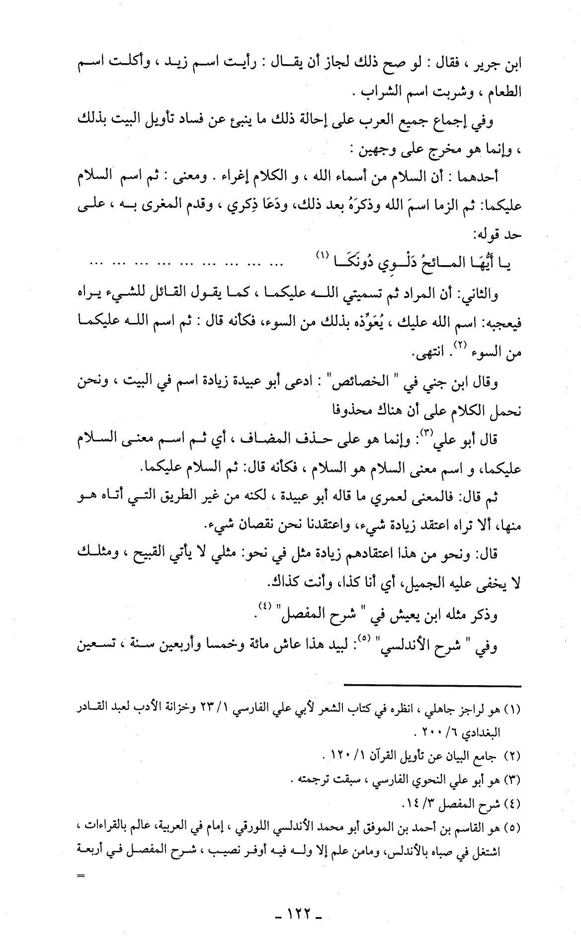 وقال ابن جني في " الخصائص ": ادعى أبو عبيدة زيادة اسم في البيت، ونحن نحمل الكلام على أن هناك محذوفا