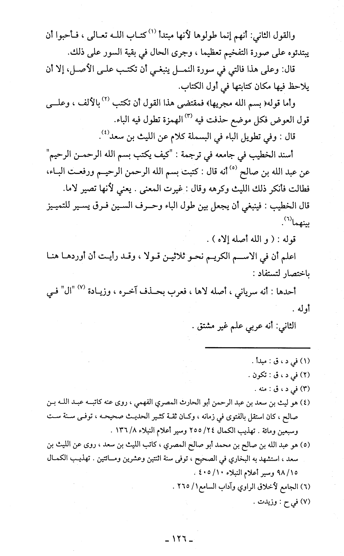 أسند الخطيب في جامعه في ترجمة: " كيف يكتب بِسْمِ اللَّهِ الرَّحْمَنِ الرَّحِيمِ " عن عبد الله بن صالح (5) أنه قال: كتبتْ بِسْمِ اللَّهِ الرَّحْمَنِ الرَّحِيمِ ورفعت الباء، فطالت فأنكر ذلك الليث وكرهه وقال: غيرت المعنى. يعني لأنها تصير لاما.