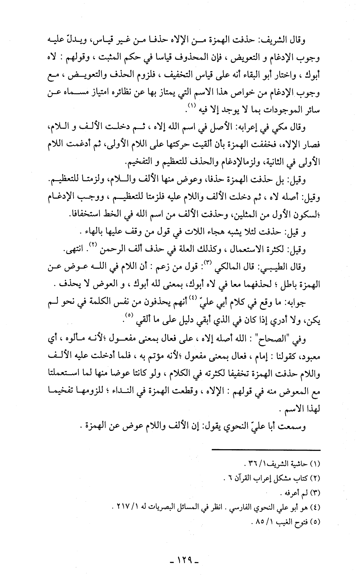 وقال الشريف: حذفت الهمزة من الإلاه حذفا من غير قياس، ويدلّ عليه وجوب الإدغام والتعويض، فإن المحذوف قياسا في حكم المثبت، وقولهم: لاه أبوك، واختار أبو البقاء أنه على قياس التخفيف، فلزوم الحذف والتعويض، مع وجوب الإدغام من خواص هذا الاسم التي يمتاز بها عن نظائره امتياز مسماه عن سائر الموجودات بما لا يوجد إلا فيه (1).