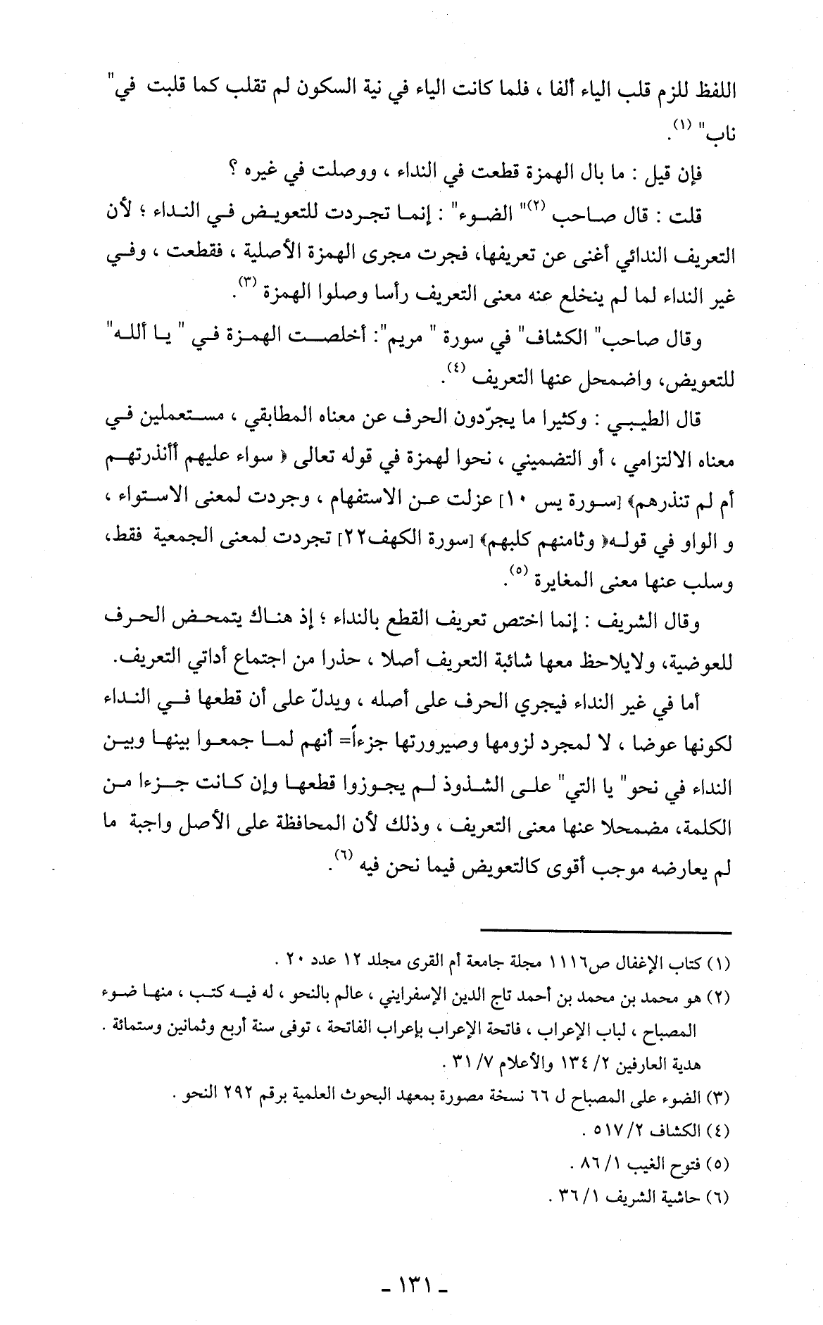 أما في غير النداء فيجري الحرف على أصله، ويدلّ على أن قطعها في النداء لكونها عوضا، لا لمجرد لزومها وصيرورتها جزءًا = أنهم لما جمعوا بينها وبين النداء في نحو " يا التي " على الشذوذ لم يجوزوا قطعها وإن كانت جزءا من الكلمة، مضمحلا عنها معنى التعريف، وذلك لأن المحافظة على الأصل واجبة ما لم يعارضه موجب أقوى كالتعويض فيما نحن فيه (6).