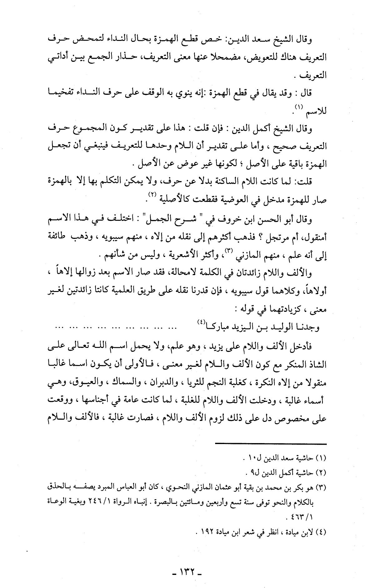 وقال الشيخ سعد الدين: خص قطع الهمزة بحال النداء لتمحض حرف التعريف هناك للتعويض، مضمحلا عنها معنى التعريف، حذار الجمع بين أداتي التعريف.