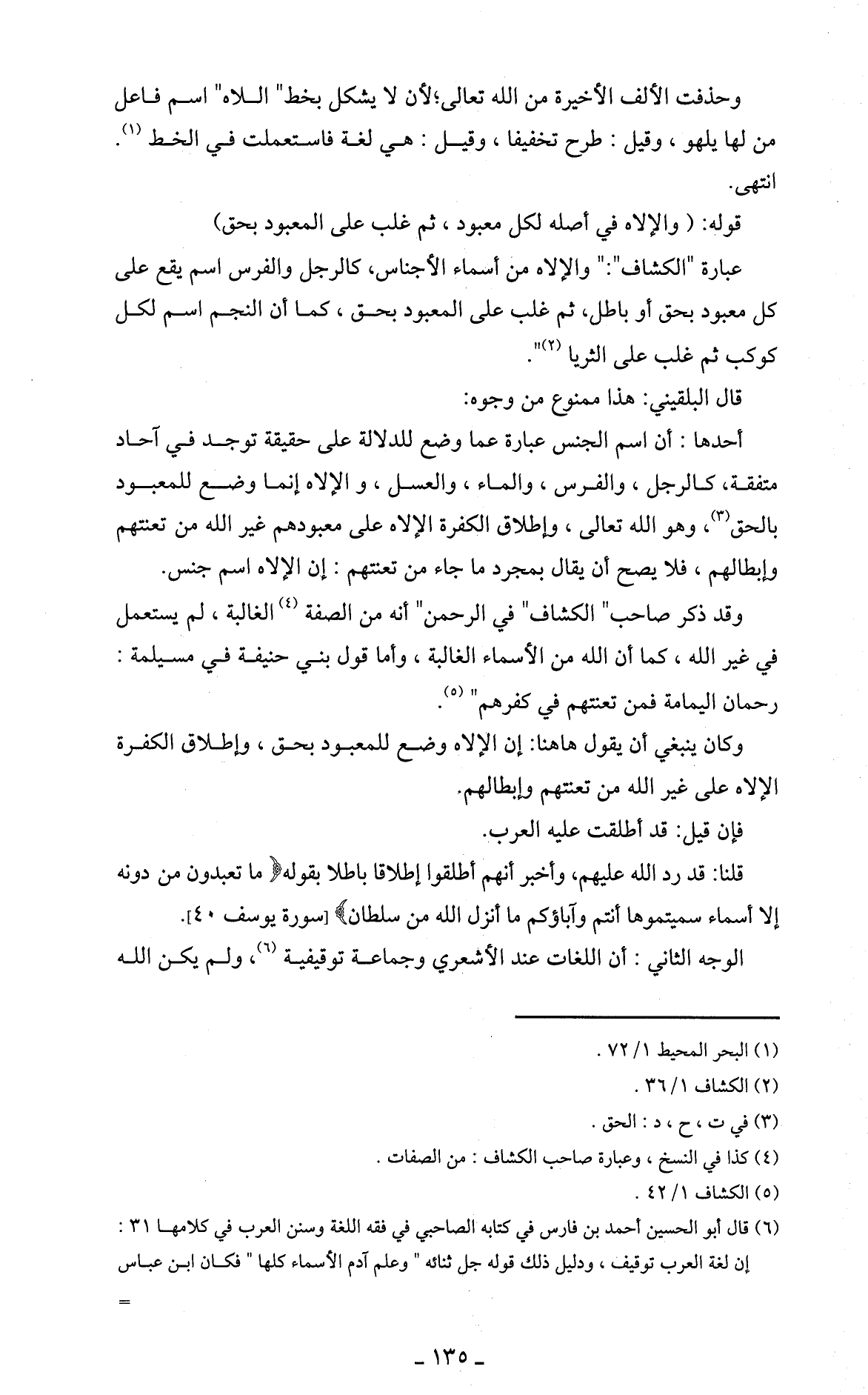 عبارة " الكشاف ": " والإلاه من أسماء الأجناس، كالرجل والفرس اسم يقع على كل معبود بحق أو باطل، ثم غلب على المعبود بحق، كما أن النجم اسم لكل كوكب ثم غلب على الثريا (2) ".