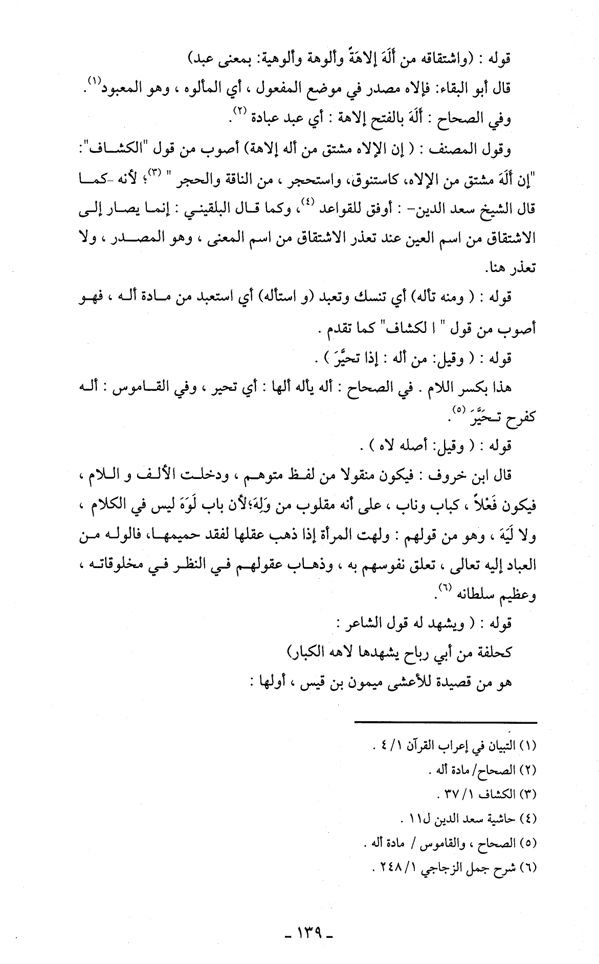 وقول المصنف: (إن الإلاه مشتق من أله إلاهة) أصوب من قول " الكشاف ": " إن أَلَهَ مشتق من الإلاه، كاستنوق، واستحجر، من الناقة والحجر " (3)؛ لأنه - كما قال الشيخ سعد الدين -: أوفق للقواعد (4)، وكما قال البلقيني: إنما يصار إلى الاشتقاق من اسم العين عند تعذر الاشتقاق من اسم المعنى، وهو المصدر، ولا تعذر هنا.