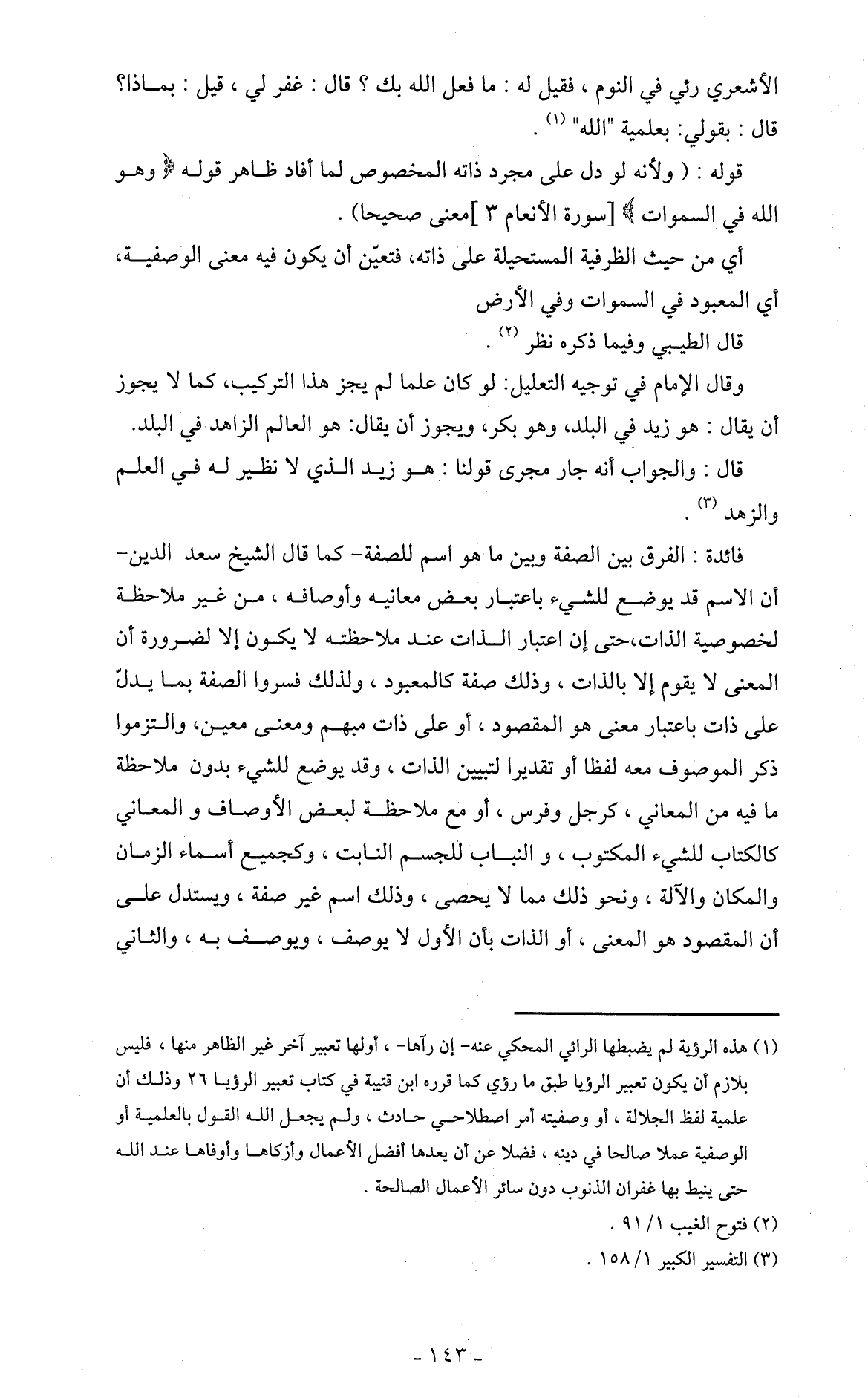 الأشعري رئي في النوم، فقيل له: ما فعل الله بك؟ قال: غفر لي، قيل: بماذا؟ قال: بقولي: بعلمية " الله " (1).