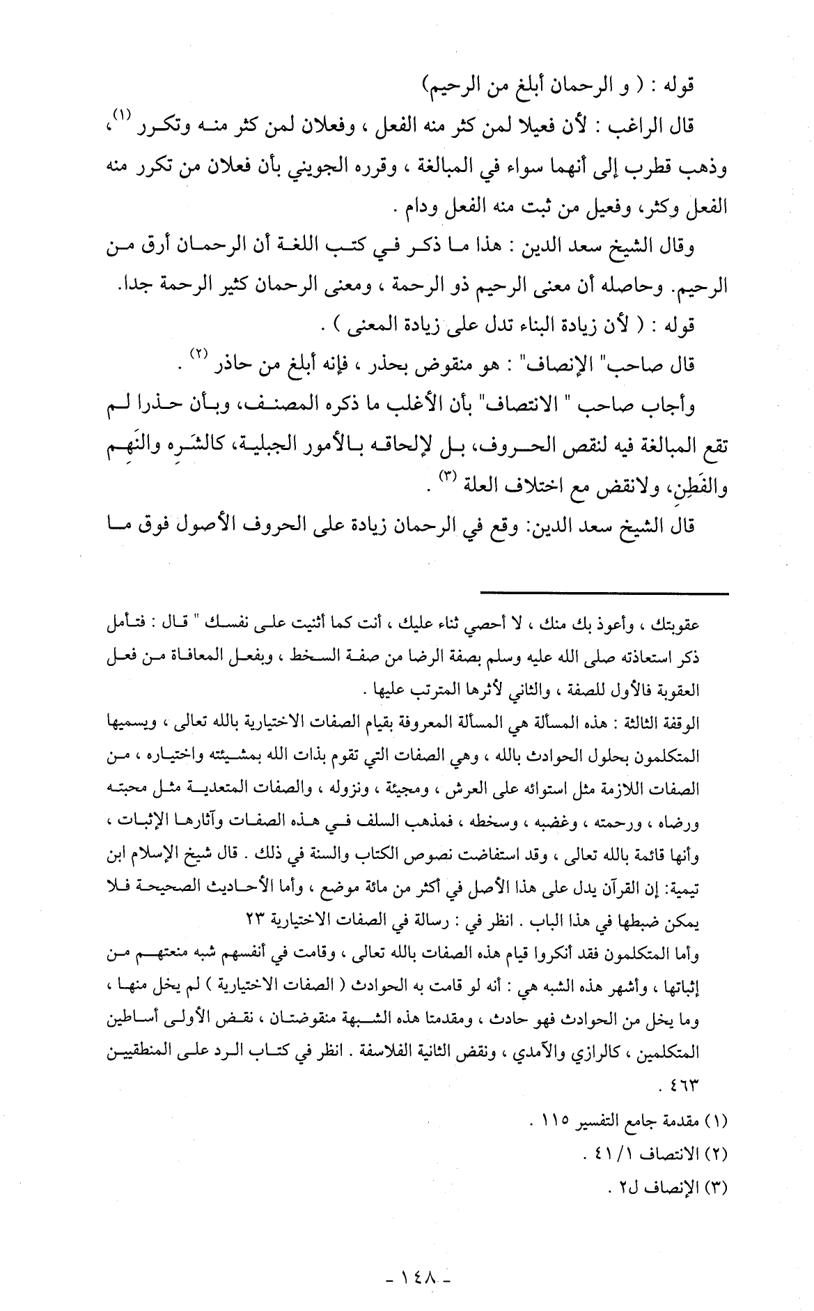 وقال الشيخ سعد الدين: هذا ما ذكر في كتب اللغة أن الرحمن أرق من الرحيم. وحاصله أن معنى الرحيم ذو الرحمة، ومعنى الرحمن كثير الرحمة جدا.