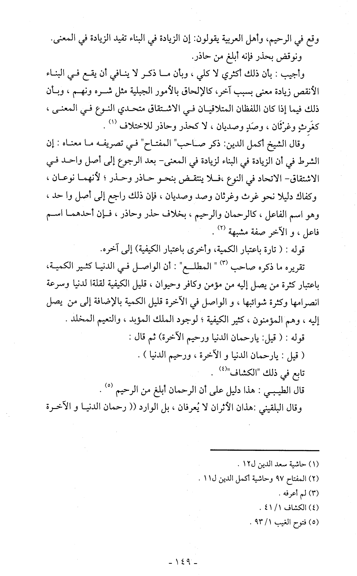 وقال الشيخ أكمل الدين: ذكر صاحب " المفتاح " في تصريفه ما معناه: إن الشرط في أن الزيادة في البناء لزيادة في المعنى - بعد الرجوع إلى أصل واحد في الاشتقاق - الاتحاد في النوع، فلا ينتقض بنحو حاذر وحذر، لأنهما نوعان، وكفاك دليلا نحو غرث وغرثان وصد وصديان، فإن ذلك راجع إلى أصل واحد، وهو اسم الفاعل، كالرحمن والرحيم، بخلاف حذر وحاذر، فإن أحدهما اسم فاعل، والآخر صفة مشبهة (2).