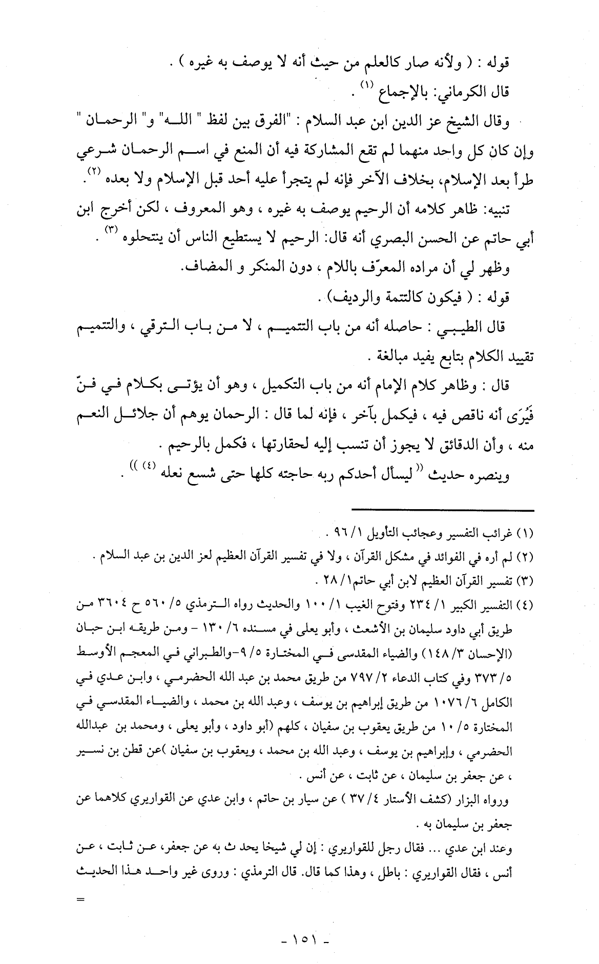 وقال الشيخ عز الدين ابن عبد السلام: " الفرق بين لفظ " الله " و " الرحمن " وإن كان كل واحد منهما لم تقع المشاركة فيه أن المنع في اسم الرحمن شرعي طرأ بعد الإسلام، بخلاف الآخر فإنه لم يتجرأ عليه أحد قبل الإسلام ولا بعده (2).