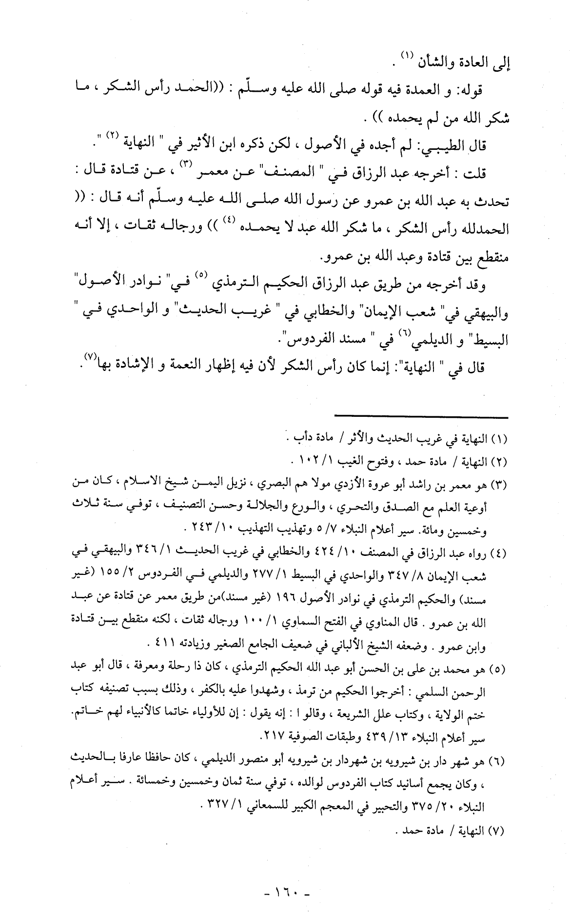قلت: أخرجه. عبد الرزاق في " المصنف " عن معمر (3)، عن قتادة قال: تحدث به عبد الله بن عمرو عن رسول الله صلى الله عليه وسلّم أنه قال: " الحمد لله رأس الشكر، ما شكر الله عبد لا يحمده (4) " ورجاله ثقات، إلا أنه منقطع بين قتادة وعبد الله بن عمرو.