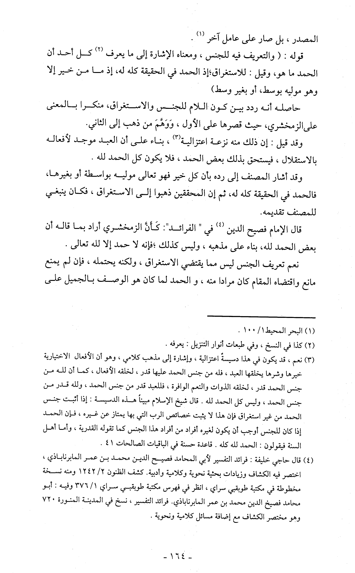 قال الإمام فصيح الدين (4) في " الفرائد ": كَأَنَّ الزمخشري أراد بما قاله أن بعض الحمد لله، بناء على مذهبه، وليس كذلك؛ فإنه لا حمد إلا لله تعالى.