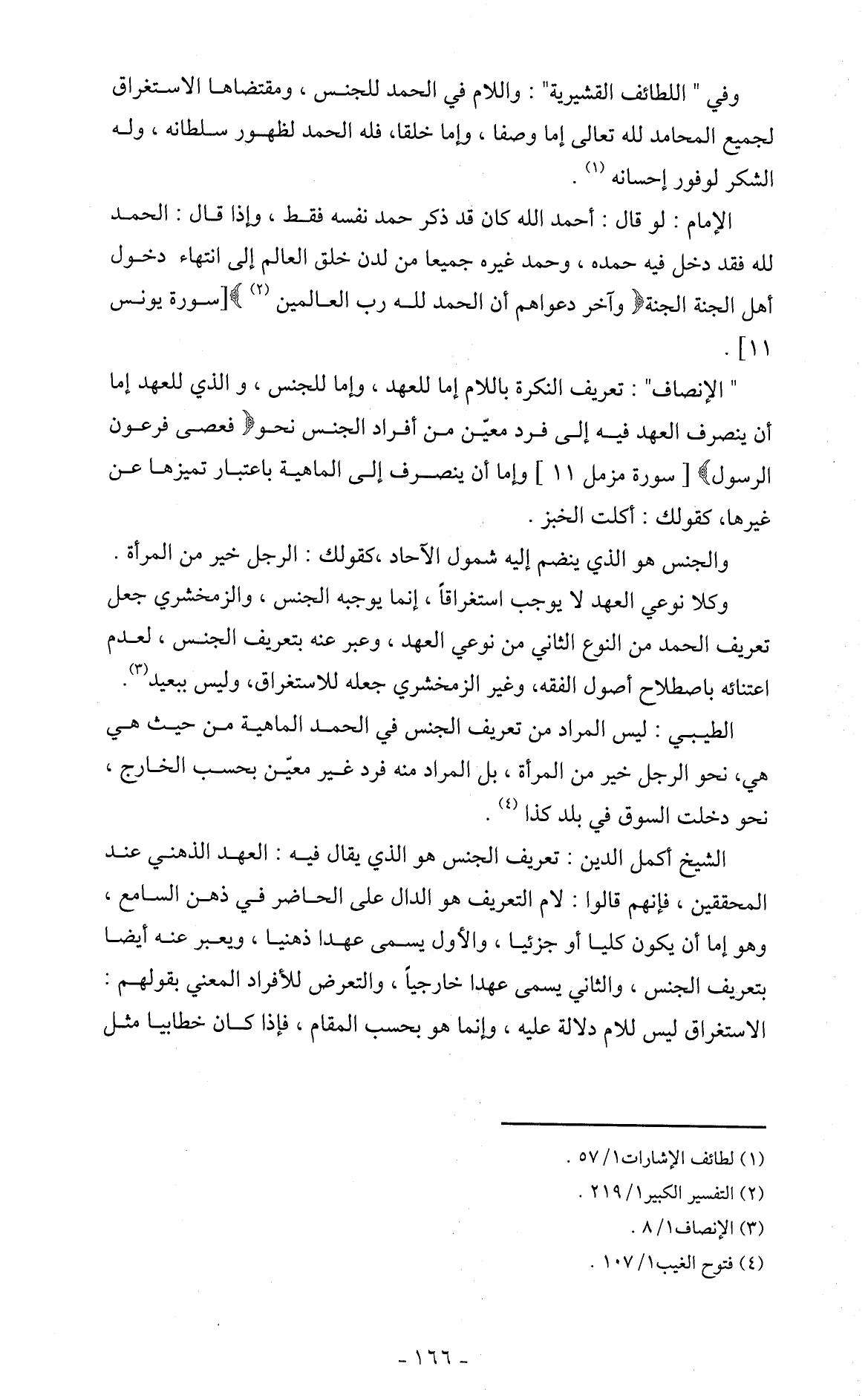 وكلا نوعي العهد لا يوجب استغراقاً، إنما يوجبه الجنس، والزمخشري جعل تعريف الحمد من النوع الثاني من نوعي العهد، وعبر عنه بتعريف الجنس، لعدم اعتنائه باصطلاح أصول الفقه، وغير الزمخشري جعله للاستغراق، وليس ببعيد (3).