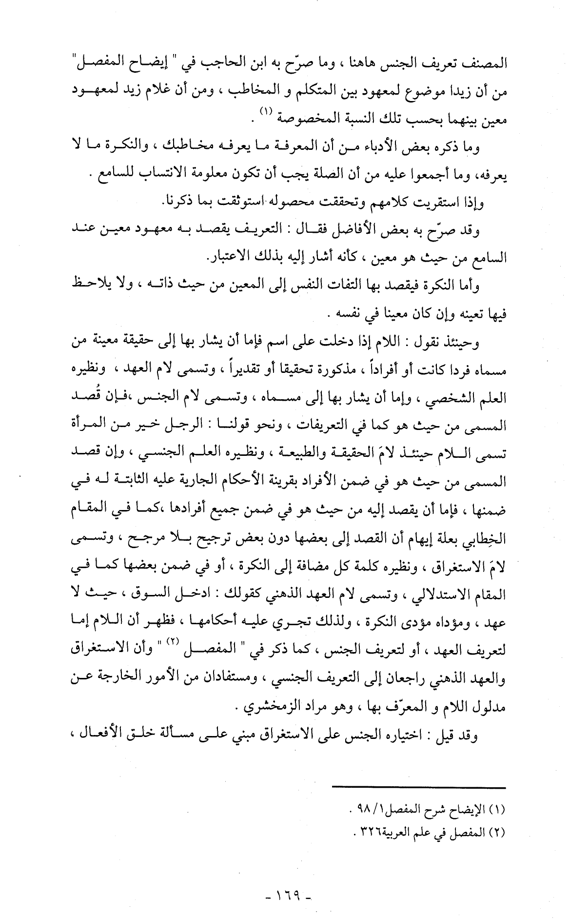 وحينئذ نقول: اللام إذا دخلت على اسم فإما أن يشار بها إلى حقيقة معينة من مسماه فردا كانت أو أفراداً، مذكورة تحقيقا أو تقديراً، وتسمى لام العهد، ونظيره العلم الشخصي، وإما أن يشار بها إلى مسماه، وتسمى لام الجنس، فإن قُصد المسمى من حيث هو كما في التعريفات، ونحو قولنا: الرجل خير من المرأة تسمى اللام حينئذ لام الحقيقة والطبيعة، ونظيره العلم الجنسي، وإن قصد المسمى من حيث هو في ضمن الأفراد بقرينة الأحكام الجارية عليه الثابتة له في ضمنها، فإما أن يقصد إليه من حيث هو في ضمن جميع أفرادها، كما في المقام الخِطابي بعلة إيهام أن القصد إلى بعضها دون بعض ترجيح بلا مرجح، وتسمى لامَ الاستغراق، ونظيره كلمة كل مضافة إلى النكرة، أو في ضمن بعضها كما في المقام الاستدلالي، وتسمى لام العهد الذهني كقولك: ادخل السوق، حيث لا عهد، ومؤداه مؤدى النكرة، ولذلك تجري عليه أحكامها، فظهر أن اللام إما لتعريف العهد، أو لتعريف الجنس، كما ذكر في " المفصل (2) " وأن الاستغراق والعهد الذهني راجعان إلى التعريف الجنسي، ومستفادان من الأمور الخارجة عن مدلول اللام والمعرّف بها، وهو مراد الزمخشري.