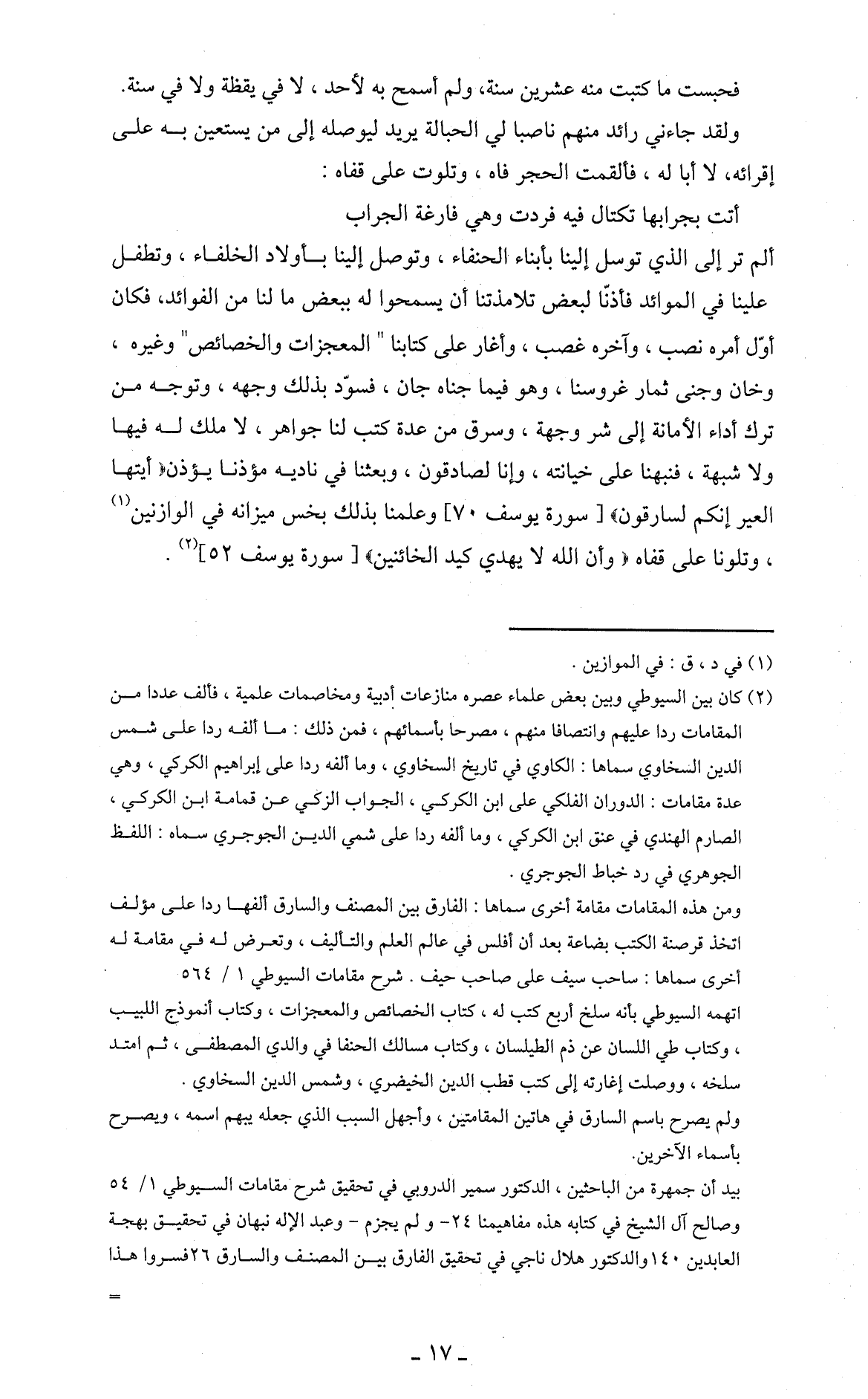 (2) كان بين السيوطي وبين بعض علماء عصره منازعات أدبية ومخاصمات علمية، فألف عددا من المقامات ردا عليهم وانتصافا منهم، مصرحا بأسمائهم، فمن ذلك: ما ألفه ردا على شمس الدين السخاوي سماها: الكاوي في تاريخ السخاوي، وما ألفه ردا على إبراهيم الكركي، وهي عدة مقامات: الدوران الفلكي على ابن الكركي، الجواب الزكي عن قمامة ابن الكركي، الصارم الهندي في عنق ابن الكركي، وما ألفه ردا على شمي الدين الجوجري سماه: اللفظ الجوهري في رد خباط الجوجري.