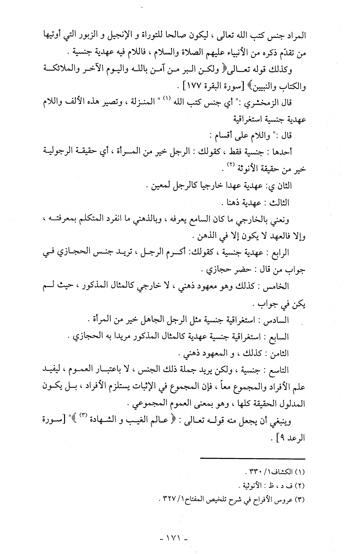 قال الزمخشري: " أي جنس كتب الله (1) " المنزلة، وتصير هذه الألف واللام عهدية جنسية استغراقية