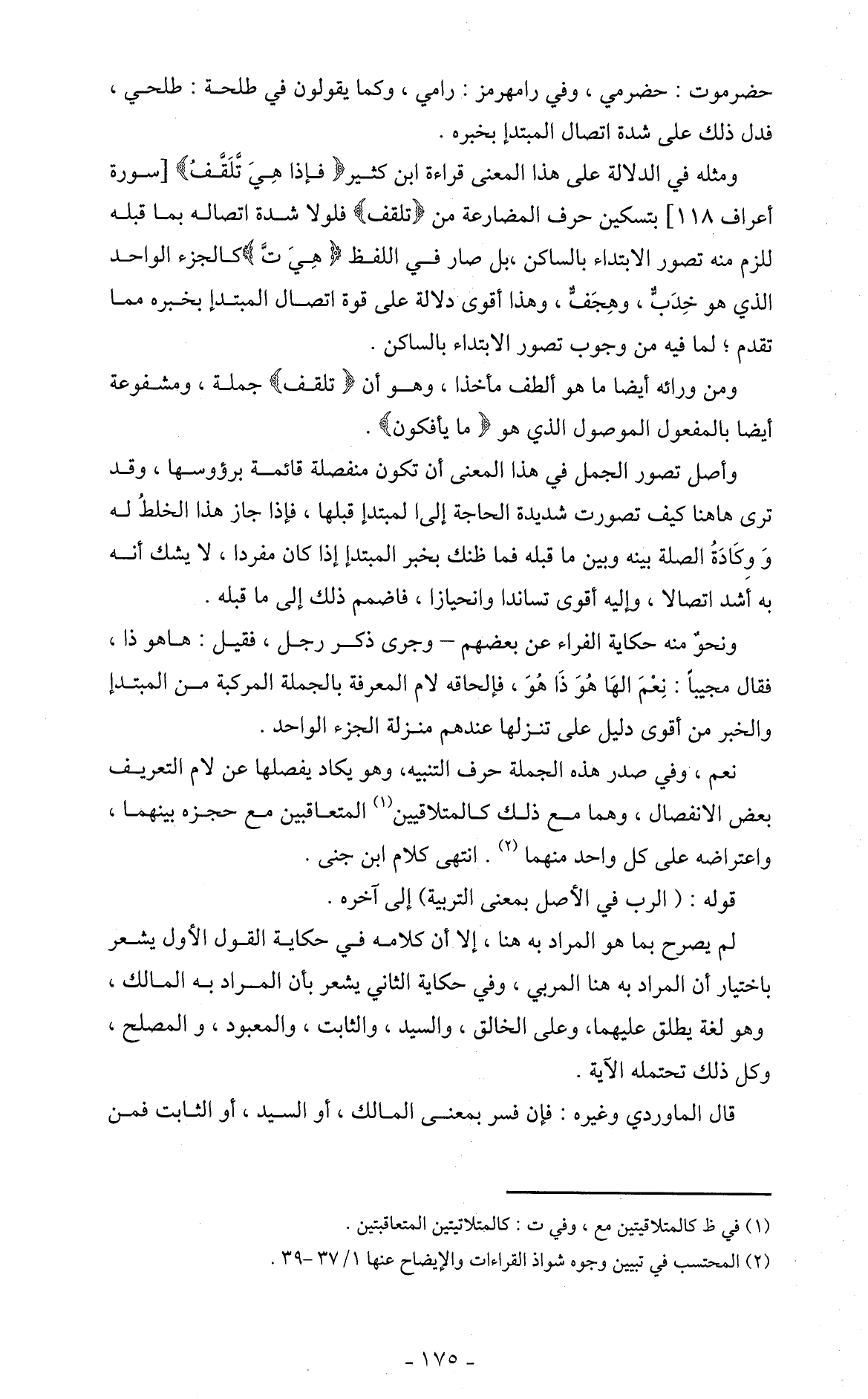 ومثله في الدلالة على هذا المعنى قراءة ابن كثير (فإذا هِيَ تُّلَقَّفُ) [سورة الأعراف 118] بتسكين حرف المضارعة من (تلقف) فلولا شدة اتصاله بما قبله للزم منه تصور الابتداء بالساكن، بل صار في اللفظ (هِيَ تَّ) كالجزء الواحد الذي هو خِدَبٌّ، وهِجَفٌّ، وهذا أقوى دلالة على قوة اتصال المبتدإ بخبره مما تقدم؛ لما فيه من وجوب تصور الابتداء بالساكن.