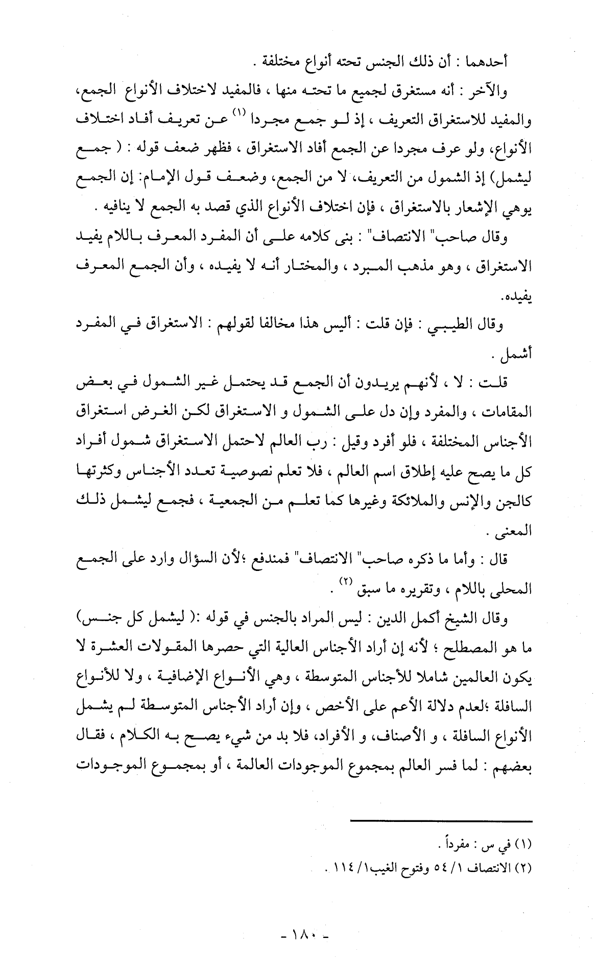 والآخر: أنه مستغرق لجميع ما تحته منها، فالمفيد لاختلاف الأنواع الجمع، والمفيد للاستغراق التعريف؛ إذ لو جمع مجردا (1) عن تعريف أفاد اختلاف الأنواع، ولو عرف مجردا عن الجمع أفاد الاستغراق، فظهر ضعف قوله: (جمع ليشمل) إذ الشمول من التعريف، لا من الجمع، وضعف قول الإمام: إن الجمع يوهي الإشعار بالاستغراق، فإن اختلاف الأنواع الذي قصد به الجمع لا ينافيه.